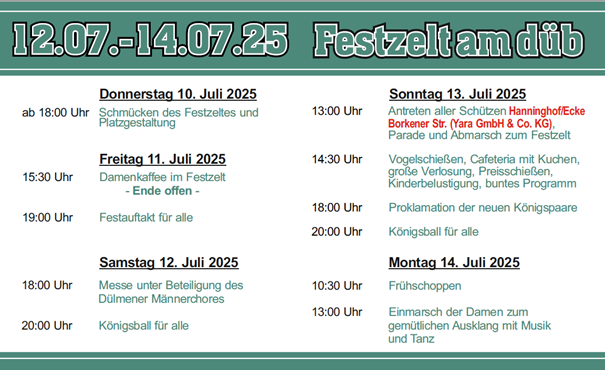 Der Sommer ist da – und mit ihm naht auch schon das Highlight unseres Vereinsjahres: Unser legendäres Schützenfest am Festplatz am Düb! Vom 10.07. an wird wieder gefeiert, marschiert, geehrt und natürlich auch geschossen – in bester Kohvedeler Manier!