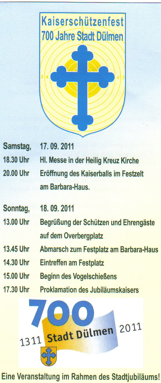 Kaiserschützenfest 2011 Veröffentlicht am 3. September 2011 von Kohvedel Anlässlich des 700. Jubiläums der Stadt Dülmen, findet in diesem Jahr ein Kaiserschützenfest aller Schützenvereine statt. Alle Kohvedeler sind zum Festball am Samstag Abend und zum Vogelschießen am Sonntag herzlich eingeladen.