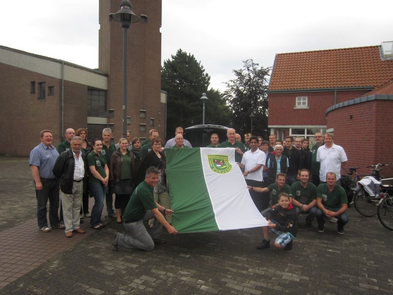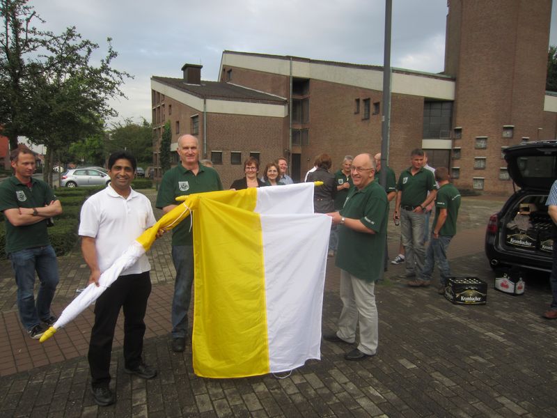 Eine Woche vor dem Beginn des Schützenfestes leiteten viele aktive Kohvedeler am vergangenen Freitag gemeinsam ihren persönlichen Countdown an der St. Josephs Kirche ein. Seit einigen Jahren hängt dort vor und während des Schützenfestes eine Fahne mit dem Vereinslogo, die auf das jährliche Highlight des Vereins, das Festwochenende, hinweisen soll. Weiterhin wird die gute Zusammenarbeit mit der Kirchengemeinde so hervorgehoben. In diesem Jahr bereiteten die Teilnehmer dem anwesenden Dechant Putthussery eine besondere Überraschung und überreichten ihm zwei neue Festtagsfahnen. Die vorhandenen Fahnen waren in die Jahre gekommen und stellten auf dem Kirchplatz kein feierliches Bild mehr da. Alle Beteiligten verbrachten gemeinsam einen schönen Abend und freuen sich nun aufs kommende Wochenende, wo hoffentlich auch viele Mitglieder der Kirchengemeinde „Zu Gast bei guten Freunden“ sein werden.