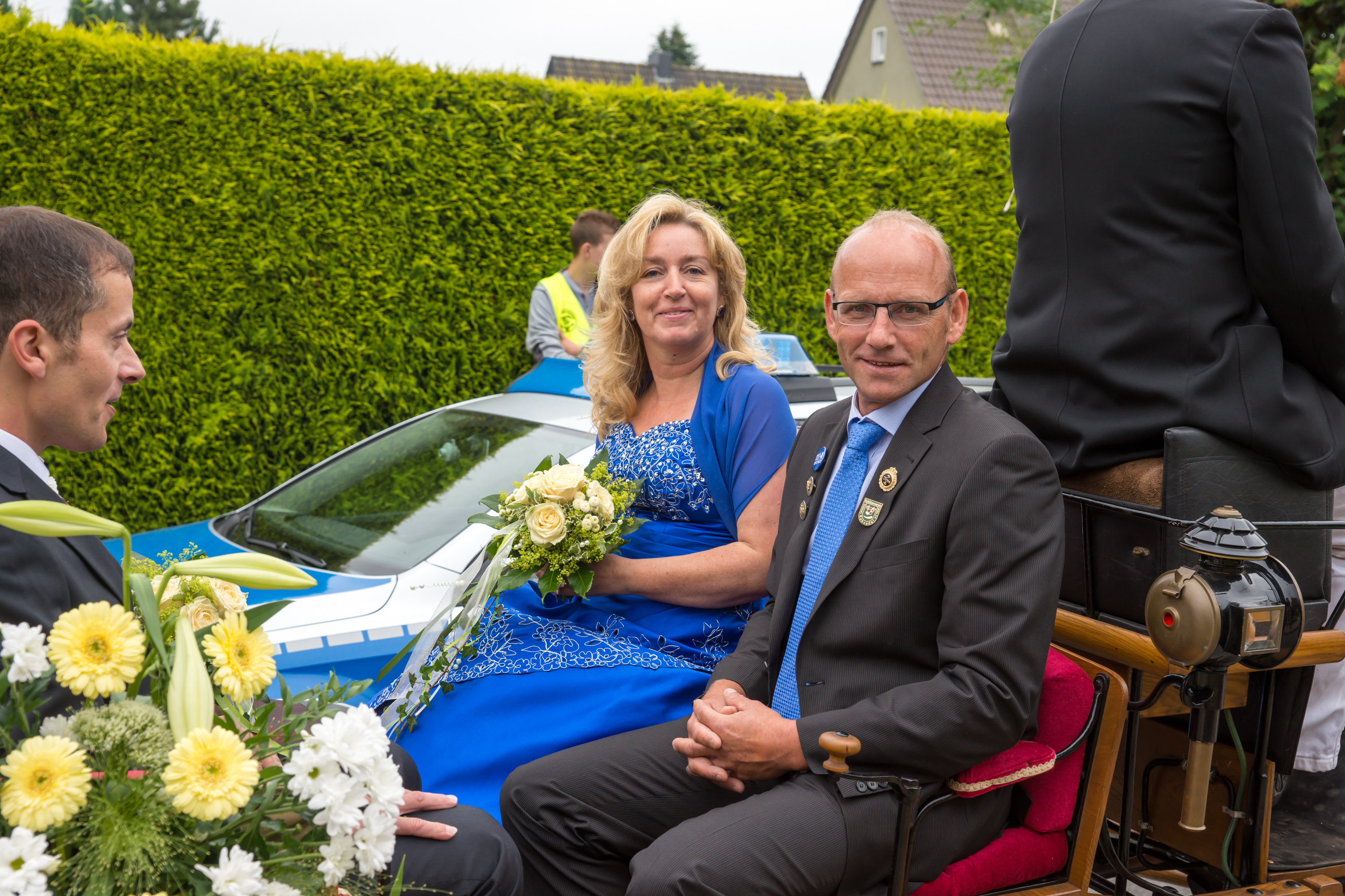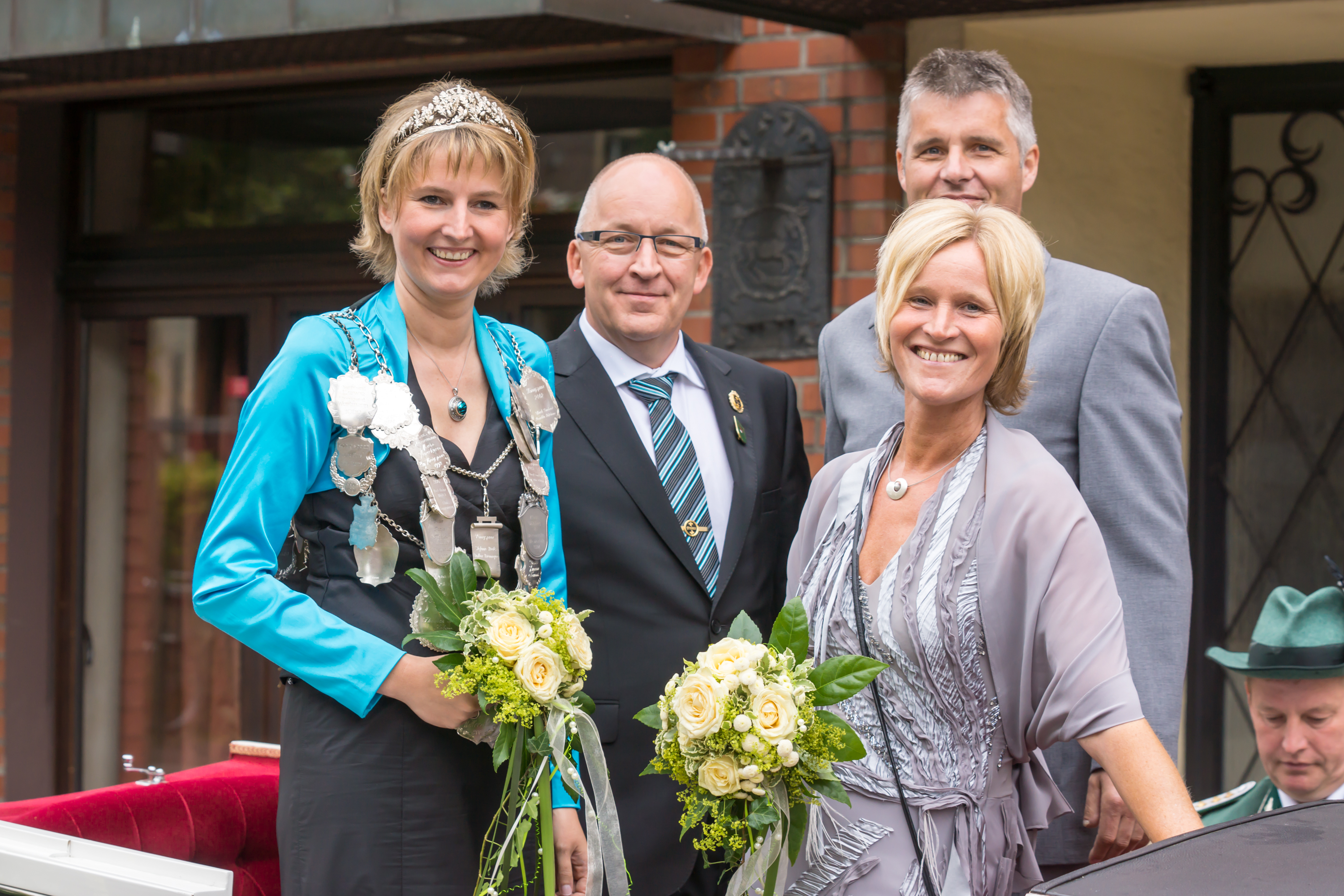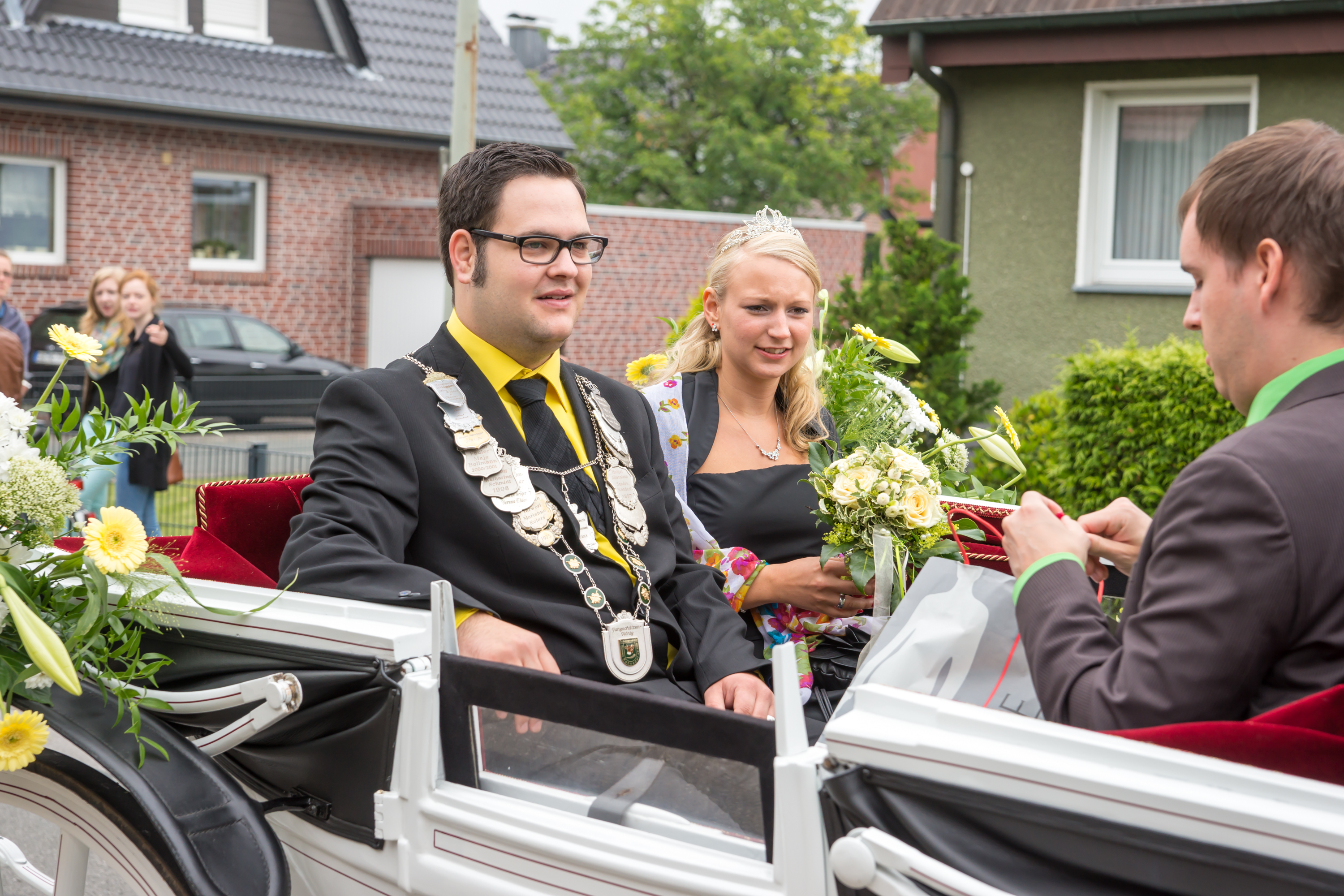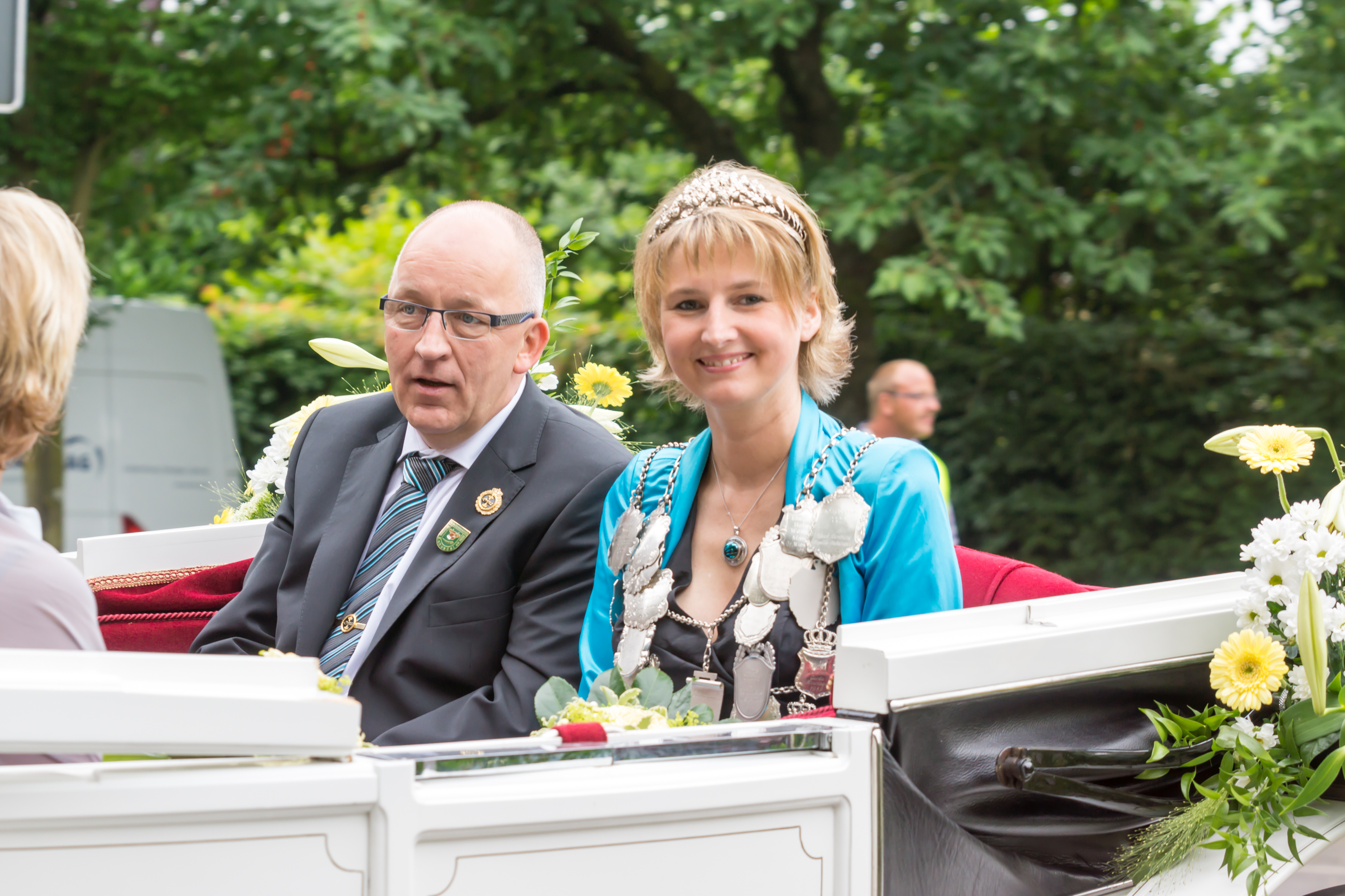 In zwei wunderschönen weißen Kutschen wurden Königin Stefanie Becks mit ihrem Prinzgemahl Volker Dieminger sowie Jungschützenkönig Dennis Niewerth mit seiner Königin Maren Sietmann zum Antreten abgeholt. Beim Anblick der Kutschen sollen beide Königshäusern ihrer Begeisterung Ausdruck verleihend, zeitgleich ausgerufen haben: „Das ist ja der Hammer“. Und das war es wirklich.