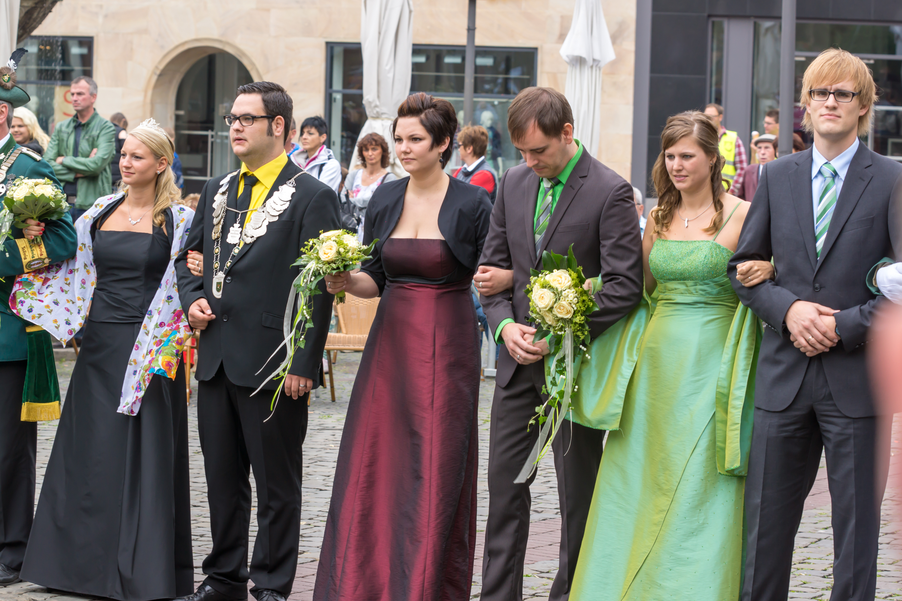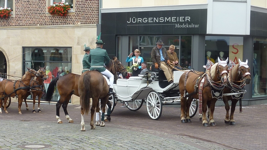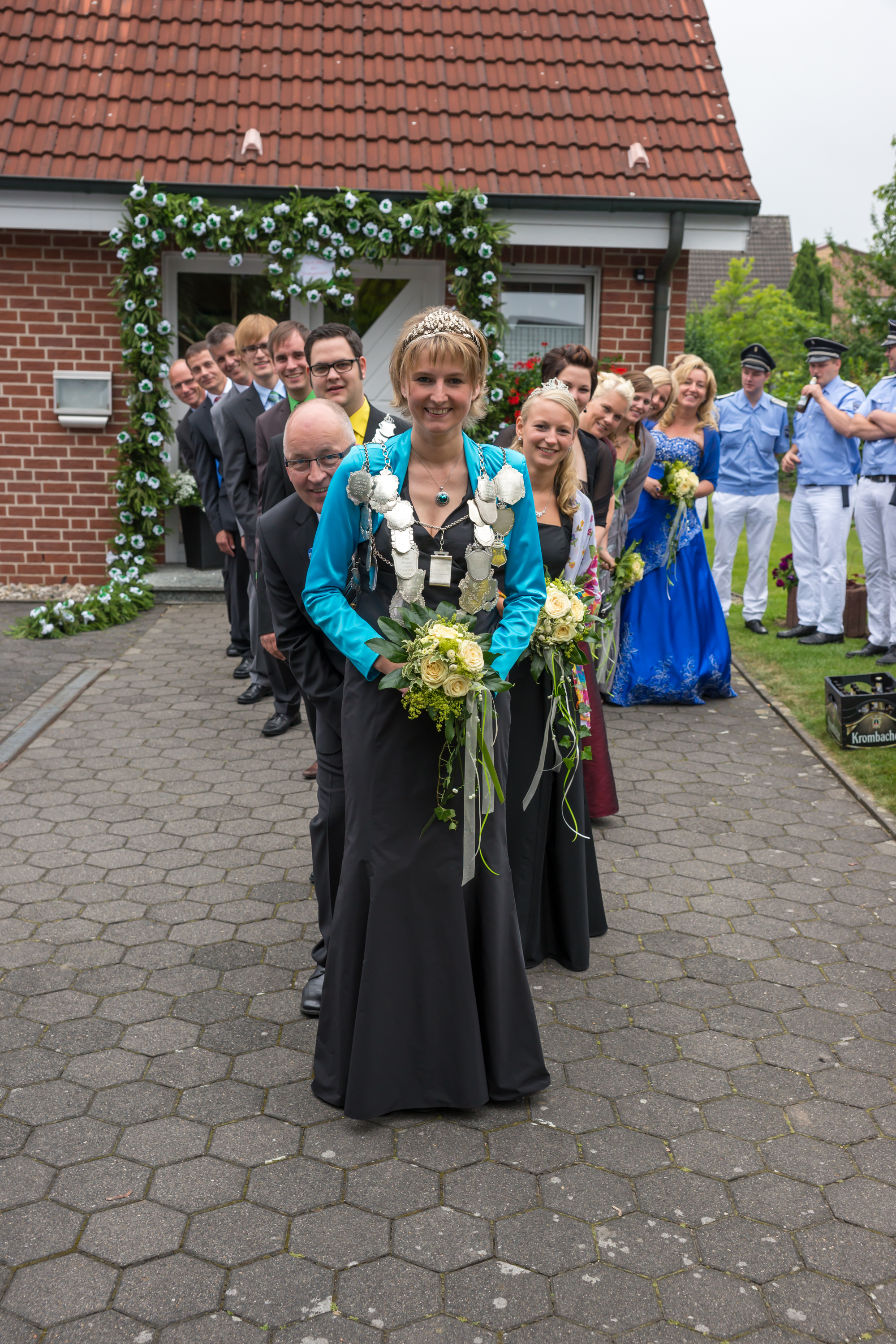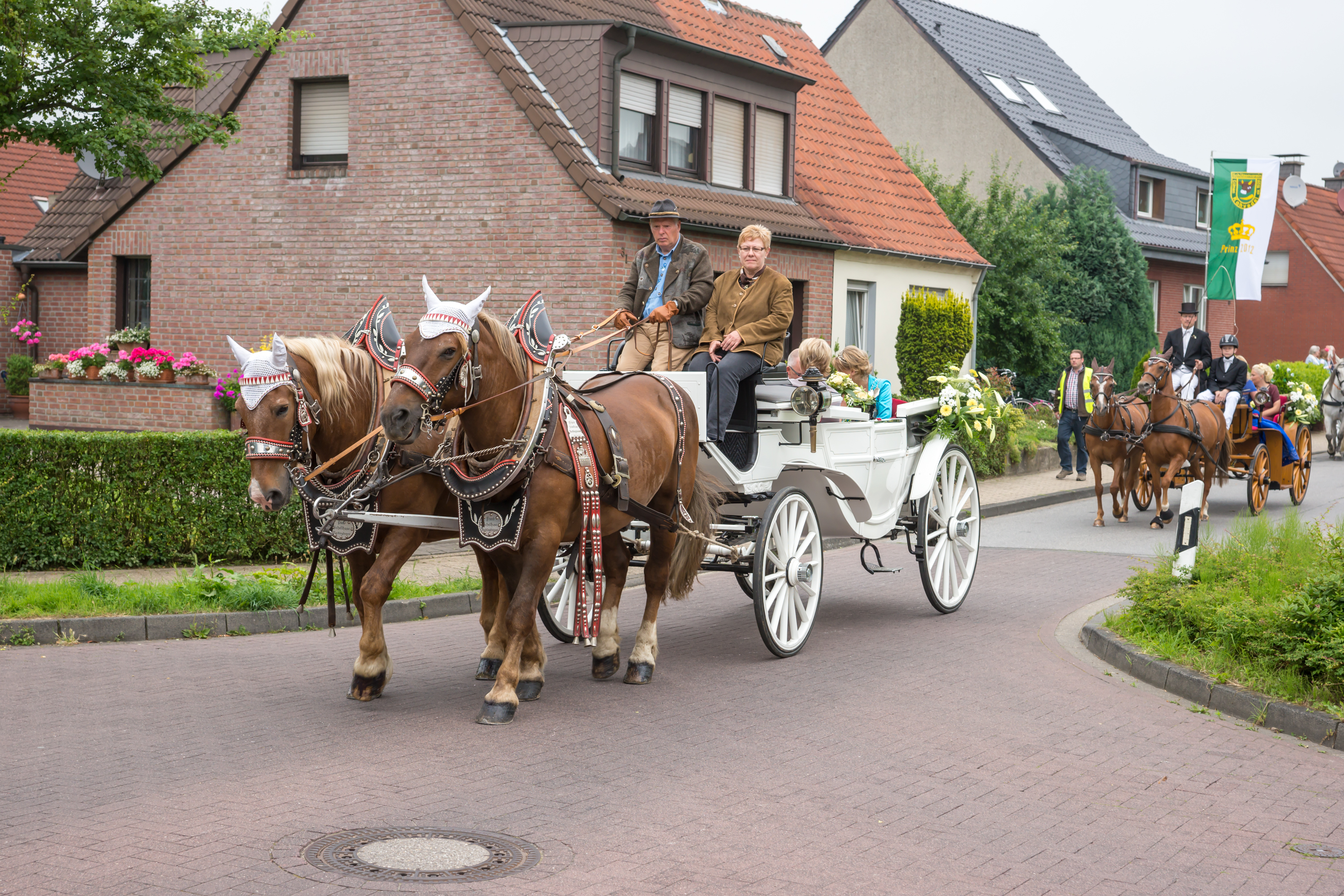 In zwei wunderschönen weißen Kutschen wurden Königin Stefanie Becks mit ihrem Prinzgemahl Volker Dieminger sowie Jungschützenkönig Dennis Niewerth mit seiner Königin Maren Sietmann zum Antreten abgeholt. Beim Anblick der Kutschen sollen beide Königshäusern ihrer Begeisterung Ausdruck verleihend, zeitgleich ausgerufen haben: „Das ist ja der Hammer“. Und das war es wirklich.