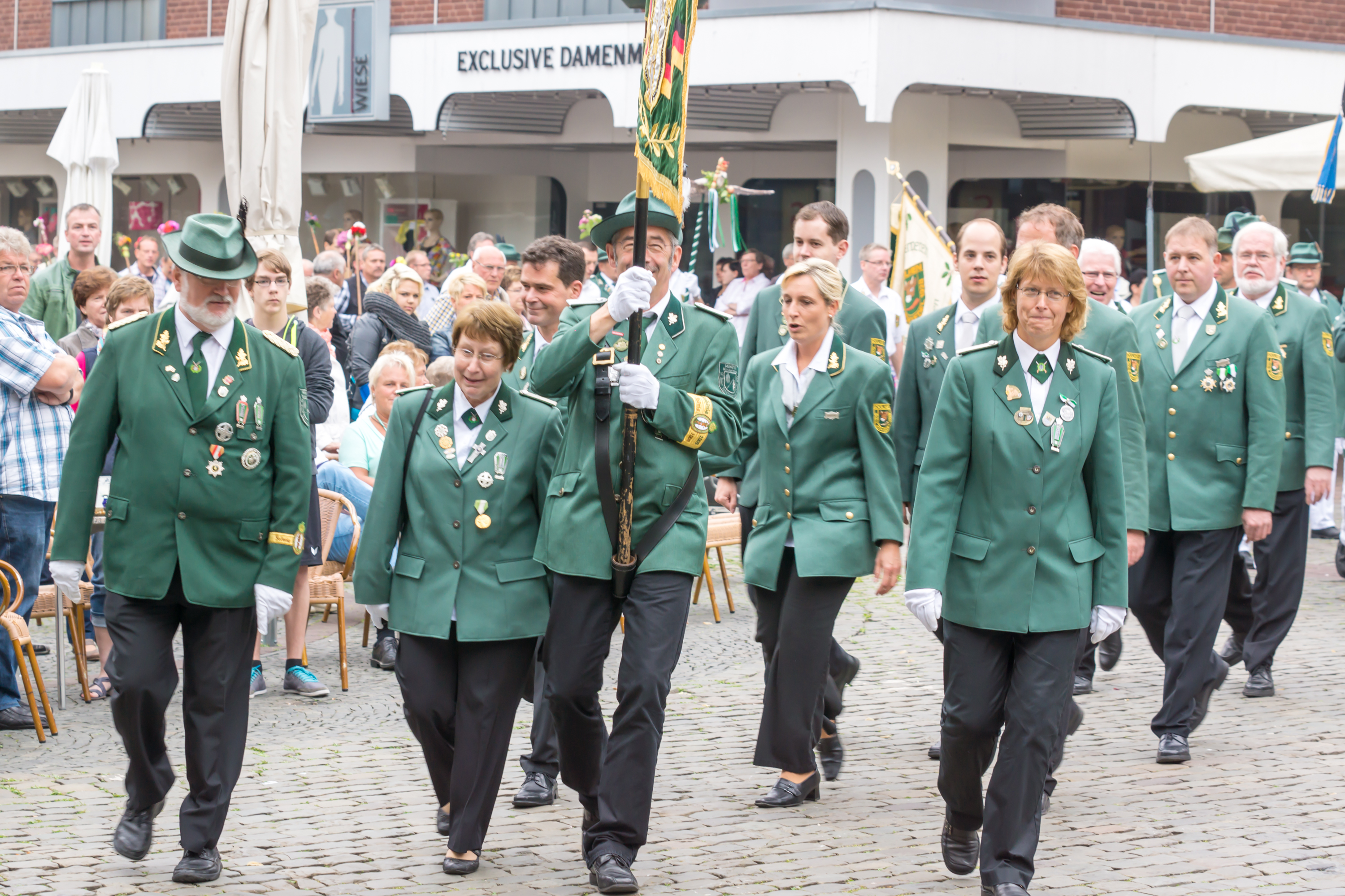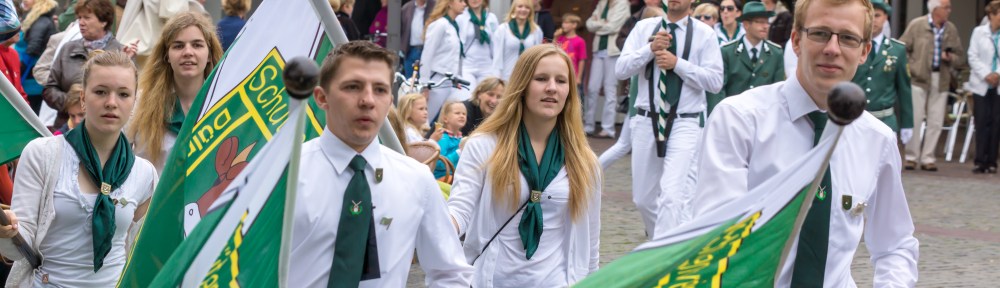 Bundesschützenkönig stolz, derart hochrangige Vereinsmitglieder als Abordnung für die Bundesstandarte gewonnen zu haben. Begleitet von der Stadtkapelle Dülmen, dem Spielmannszug Wulfen und dem Landsknecht Fanfarenkorps Haltern am See machte der Zug nicht nur optisch, sondern auch musikgewaltig auf sich aufmerksam. Zahlreiche Kinder reihten sich in den Zug ein und zogen das Maskottchen der Kohvedeler, die Kuh „Kohveline“ mit zum Festplatz. Dort angekommen erhielten die fleißigen Kinder für die Mühe von Königin Stefanie und Prinzgemahl Volker jeweils einen Orden.