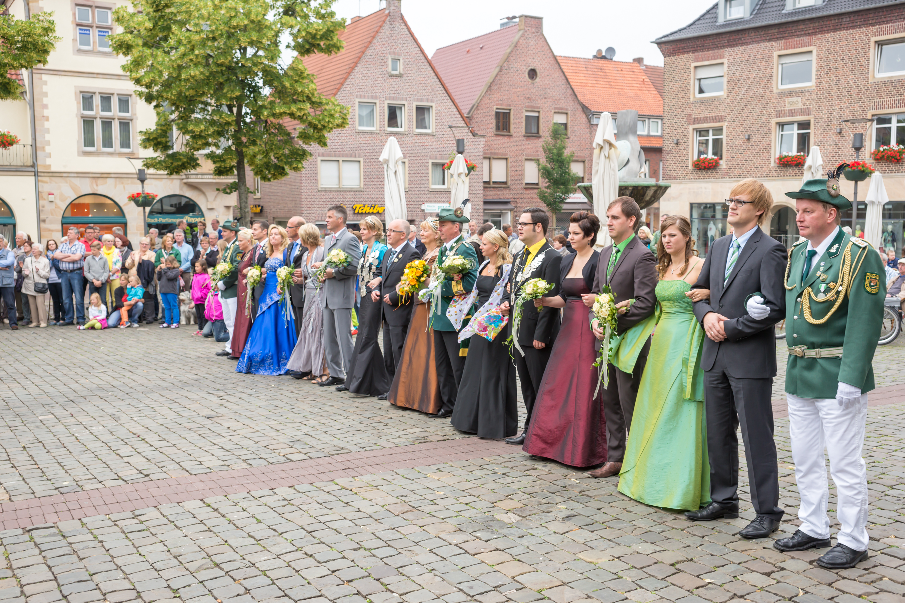 Begleitet wurden Sie von zwei weiteren Kutschen mit dem Hofstaat und zwei berittenen Offizieren in Person von Ulli Niehues und Jogi Gerversmann. Nach Abnahme der Meldung, des Parademarsches und der Präsentation des Fahnenschlages auf dem Marktplatz unter reger Beteiligung der Dülmener Bevölkerung setzte sich ein wahrer Lindwurm als Festzug durch die Innenstadt zum Festplatz am düb in Bewegung.