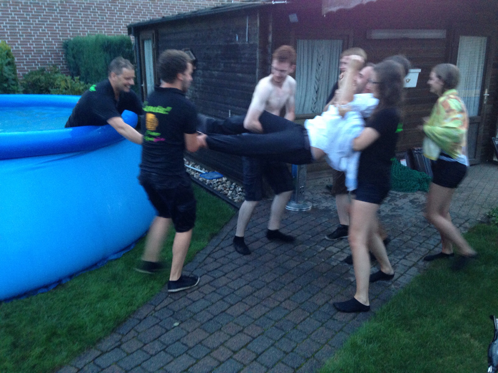 Und hier bot sich die Möglichkeit zur Abkühlung. Freiwillige Abkühlungen, aber auch nachdrücklich überzeugende Argumentationsketten für fröhliche „Jetzt bist du dran“ Poolwürfe. Unabhängig von Geschlecht, Funktion, Alter oder Alkoholpegel landeten fast alle „Eierbacker“ irgendwann im feuchten Nass.