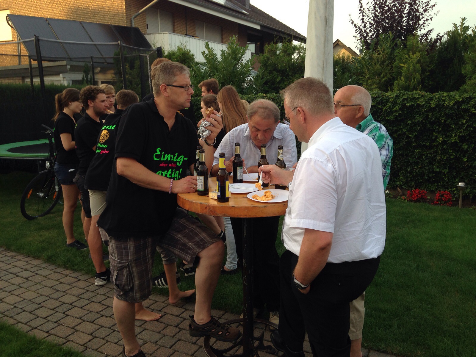Bei hochsommerlichen Temperaturen war es eine schweißtreibende Angelegenheit und die fleißigen Boten hatten mehrere Stunden intensiv zu tun, bis alle Briefkästen in unserem Bezirk gefüllt waren.Als Entschädigung winkte dafür der Frühschoppen, bzw. das Kaffeetrinken beim Sommerfest in Leuste, das auch zahlreiche Kohvedeler anschließend besuchten. Bei netten Gesprächen, gutem Wetter und dem ein oder anderen Bierchen (zuviel?) entstand offensichtlich die Idee, das Sommerfest im Garten unseres Kassierers Christian Becks mit einem zünftigen Eierbacken ausklingen zu lassen.