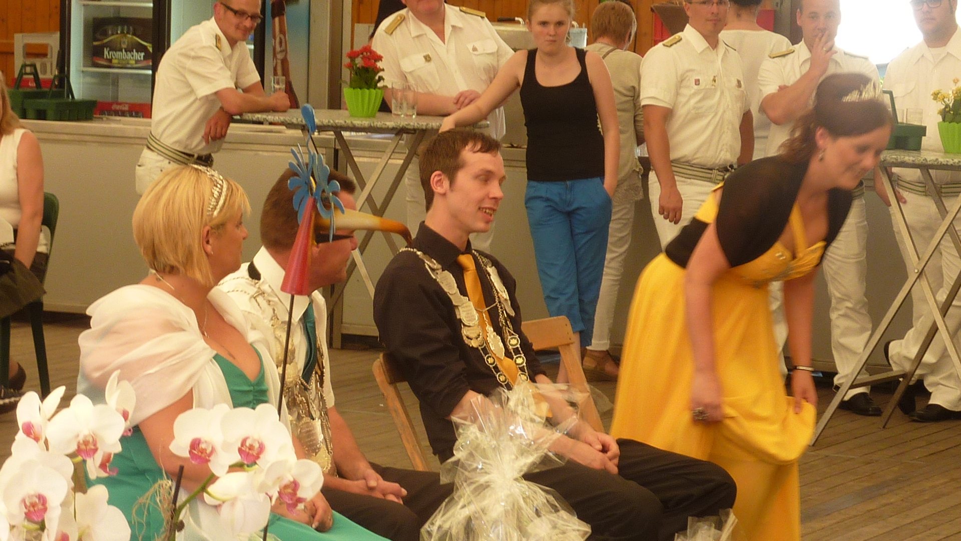 Eine ganz besondere Ehrung wurde unserer Goldkönigin Ulla Havestadt zuteil, die im Jahr 1965 Königin der Kohvedeler war. Frenetischer Applaus war die Würdigung für die vielen Jahre Treue zum Verein. Eine Ehrennadel und einen Blumenstrauß überreichte der Verein an Ulla. Volker richtete sich mit einem Augenzwinkern an die Festteilnehmer als er bemerkte, das eine Königin im Kohvedel sehr jung und frisch bleiben würde, wie man ganz deutlich bei Ulla erkennen könne. Insoweit kann er nur jeder Dame anraten, selbst einmal als Königin die Kohvedeler zu regieren.