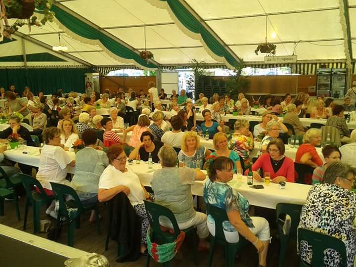 Strahlender Sonnenschein begleitete die Damen am Freitag Nachmittag ins Festzelt der Kohvedeler zum beliebten Damenkaffee. Ein prall gefülltes Festzelt, super Stimmung, ein tolles Rahmenprogramm, eine hochwertige Tombola und schmackhafte Köstlichkeiten der Bäckerei Böckmann; das waren die Zutaten, die die Gäste genießen konnten. Und diese Zutaten waren es auch, die den Damenkaffee wieder einmal zu einem Erfolg werden ließ. Bereits deutlich vor dem offiziellen Beginn des Damenkaffees war das Zelt fast bis auf den letzten Platz gefüllt und so konnten die Königspaare Bastian Wübbeling mit Jessica Engbers und Lothar Engbers mit Yvonne Kadiri bei ihrem Einmarsch ins Festzelt die Ovationen der Damen entgegen nehmen.