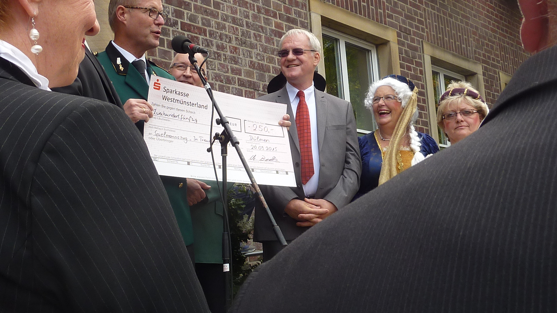 Nach den Grußworten des Vorsitzenden Heribert Töns, der Bürgermeisterin Lisa Stremlau und des Landtagsabgeordneten Werner Jostmeier gratulierte unser Vorsitzender Volker Dieminger im Namen der innerstädtischen Schützenvereine Bürger, Nieströter, Pluggendorf und Kohvedel dem Spielmannszug zum 60. Jubiläum und übergab ein gemeinsames Geschenk der innerstädtischen Schützenvereine an den Spielmannszug zur Anschaffung neuer Instrumente. Anschließend gratulierten auch die anderen Dülmener Schützenvereine und Spielmannszüge mit teils augenzwinkernden Ansprachen.