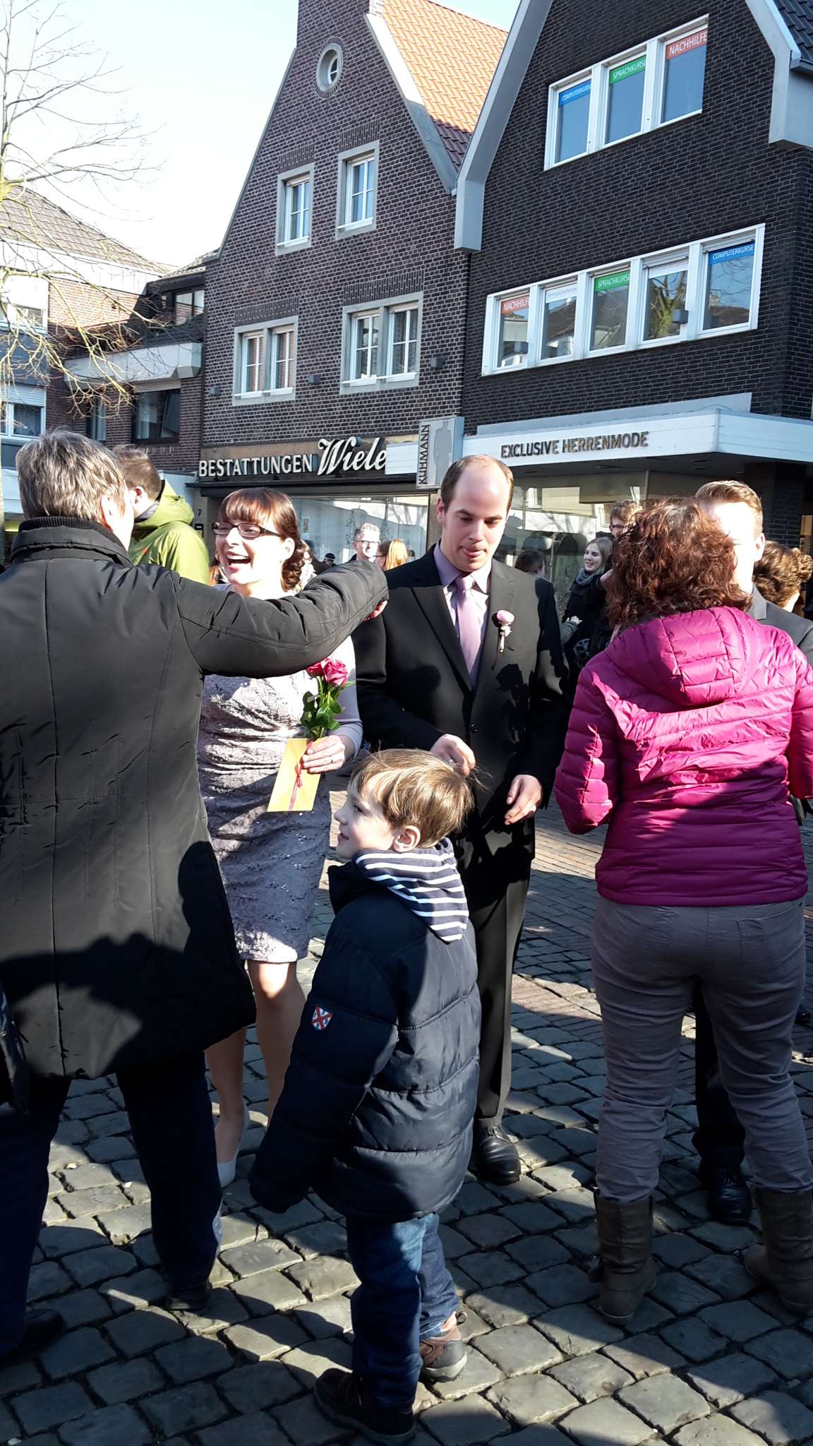 Politik und Verwaltung arbeiten an Konzepten und Überlegungen, wie der Dülmener Marktplatz und die Innenstadt auch am Wochenende belebt werden können. Dabei ist die Lösung ganz einfach: Mirko und Sarah geben sich vor der Standesbeamtin das „JA-Wort“ und der Marktplatz platzt aus allen Nähten. „Rappelvoll“ zeigte sich der Platz bereits kurz nach 11.30 Uhr, als die Trauung der beiden gerade erst begonnen hatte. Und es wurden immer mehr. Freunde, Bekannte, Schützen, Sänger, Musiker, ein buntes Stelldichein der Dülmener Gesellschaft. Und alle wollten dem jungen Paar zu diesem gemeinsamen Schritt gratulieren. Natürlich auch zahlreiche Vertreter unseres Schützenvereins, die dem aktiven Paar ihr Glückwünsche überbrachten. Perfekt war dabei unserer Vanessa die Farbauswahl des Blumenstraußes gelungen.