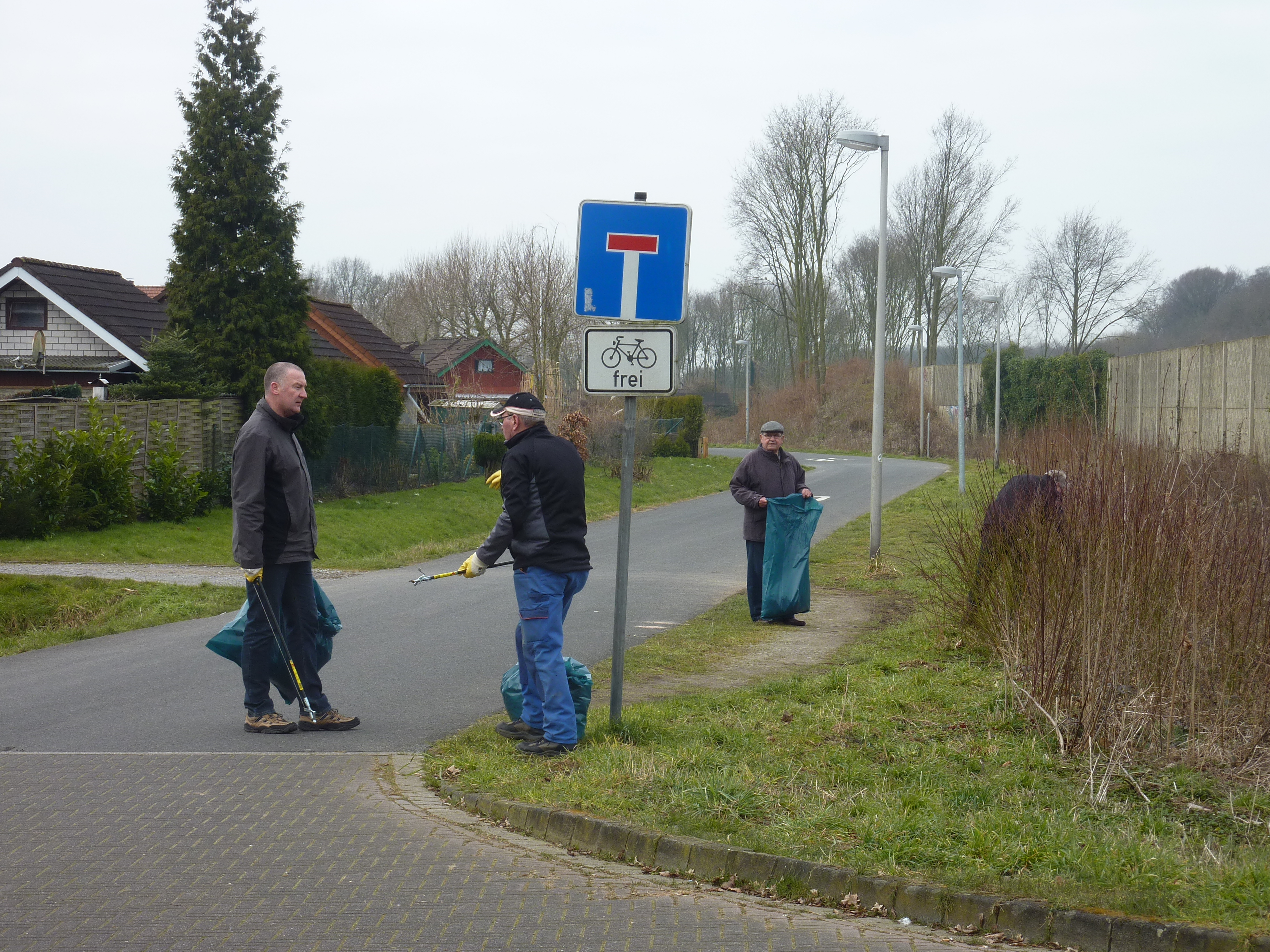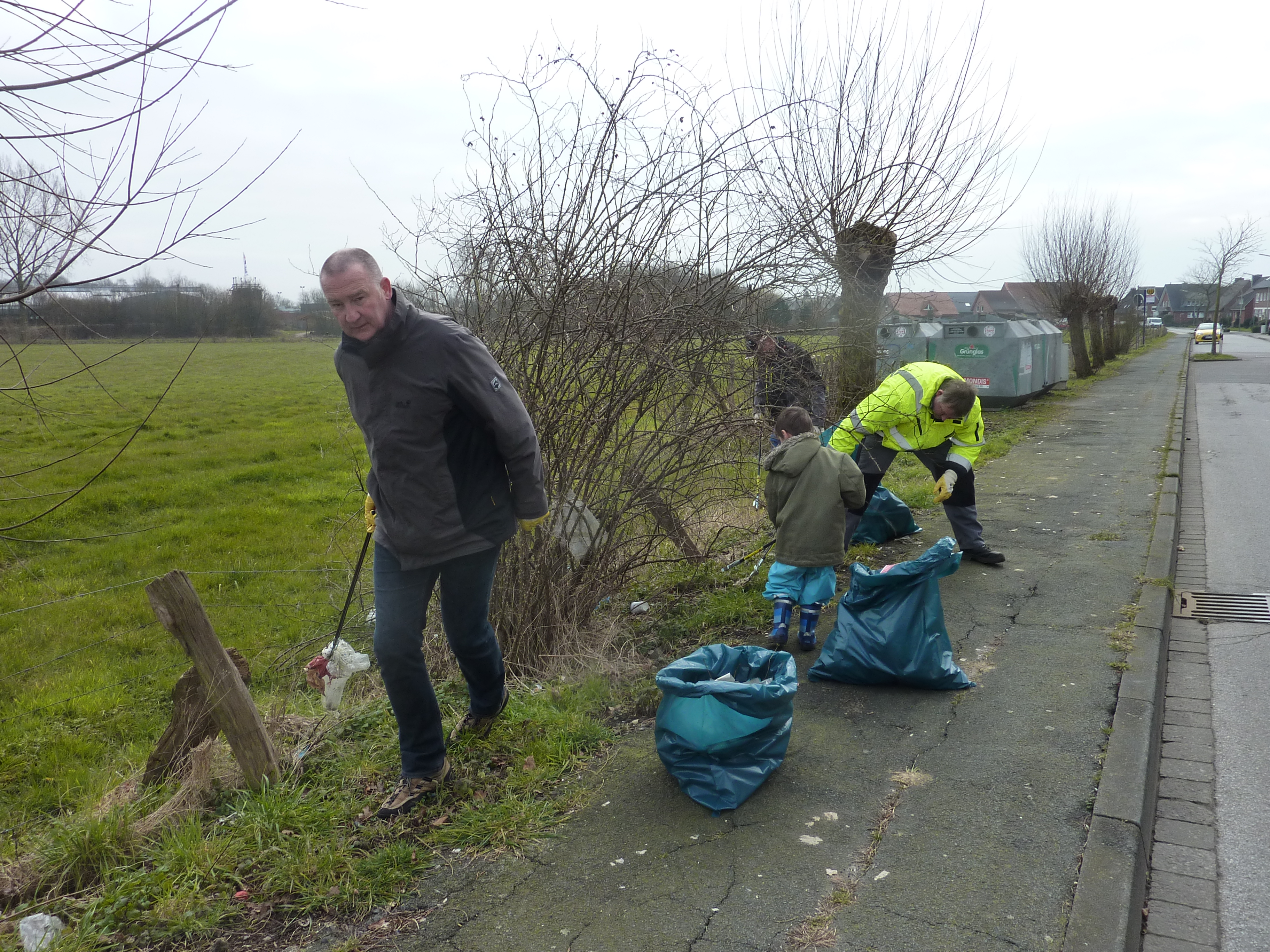 Gegen 09.30 Uhr bewaffneten sich alle Helferinnen und Helfer mit Handschuhen, Müllsäcken und Greifzangen und schwärmten in unser Gebiet aus. In kleinen Gruppen rückten die Schützenbrüder gemeinsam mit ihrer Königin Yvonne und ihrer Tochter Amy dem Müll zu Leibe und sammelten reichlich und umfangreich Unrat wie Flaschen, Hundekotbeutel, Windeln, Plastikverpackungen, Lichtschachtroste und Reifen.