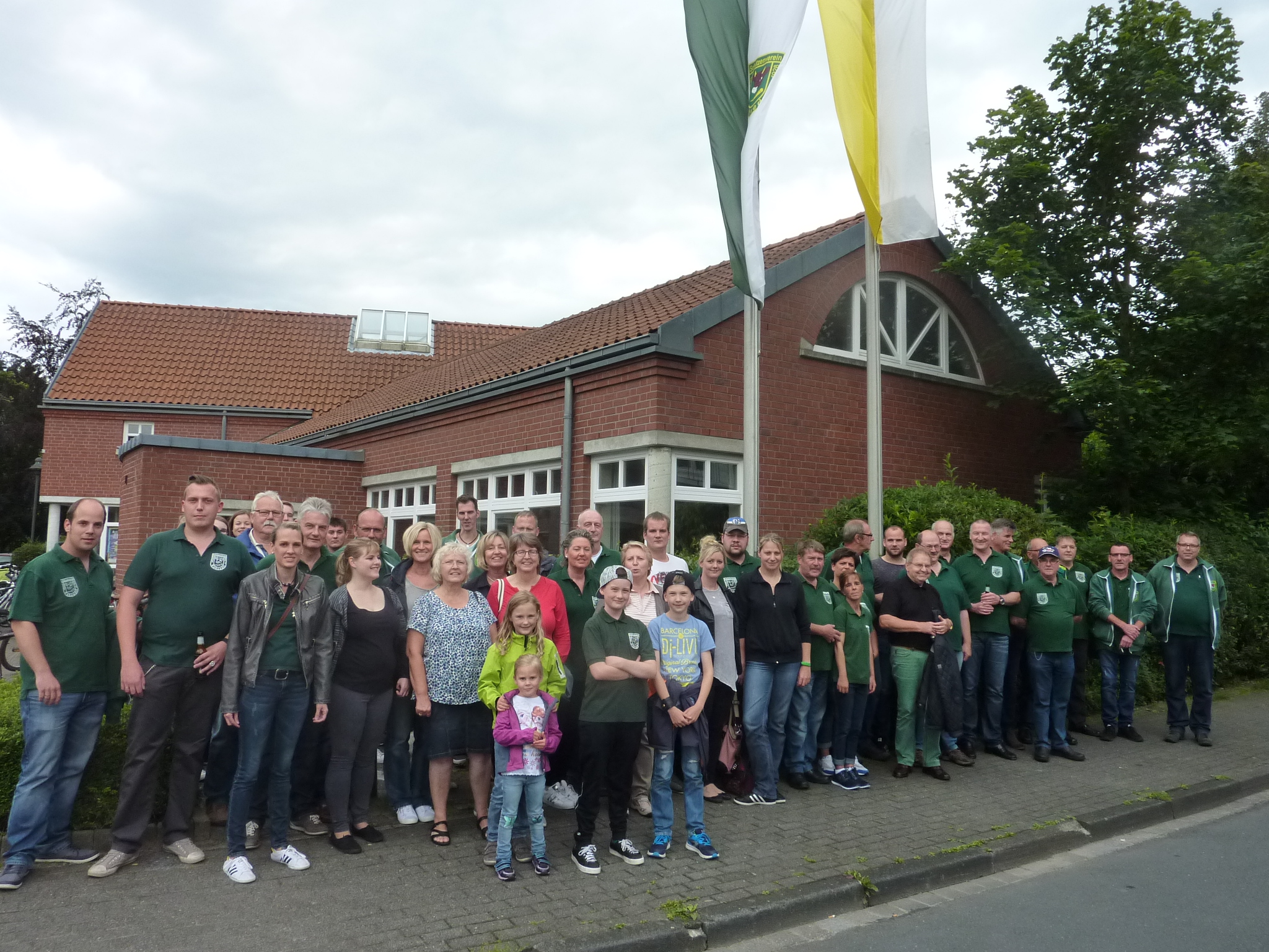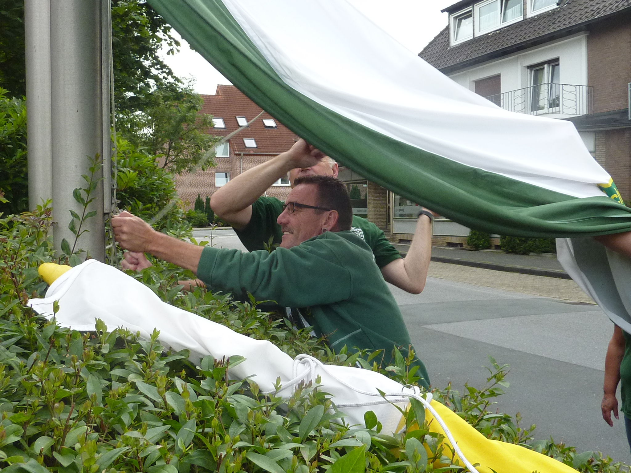 Schon als kleine Tradition bezeichnet Martin den schönen Anlass, vor der Kirche sowohl die weiß-gelbe Kirchenfahne, als auch unsere Vereinsfahne aufzuhängen. „Wir wollen damit unsere Verbundenheit zu unserer Kirche und zu unserem Wohnquartier zum Ausdruck zu bringen“, so Martin zum Hintergrund der Aktion. Natürlich hatte Martin auch wieder für gekühlte Getränke und perfektes Wetter gesorgt und so wurde die Aktion zu einem gelungenen Auftakt in die von vielen Schützinnen und Schützen ersehnte „schönste Woche des Jahres“.