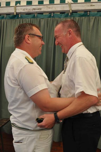In einem launigen Vortrag machte Volker Dieminger dann aus seiner beruflichen Funktion heraus deutlich, was eine Sprungbeförderung ist und unter welch engen Voraussetzungen derartige Sprungbeförderungen überhaupt nur möglich sind, um dann die Katze aus dem Sack zu lassen und Björn Strietholt als Kommandeur der Kohvedeler für eine Sprungbeförderung vom Major zum Oberst vorzuschlagen. Dies vor allem aufgrund seines zusammenführenden Wesens im Verein, seiner Aktivitäten in Sachen Vereinsfahne, seiner Aufbauarbeit was die Kontakte zu den anderen Vereinen oder auch zu den Musikkapellen anbelangt. Aber auch aufgrund seines überobligatorsichen Einsatzes für den Verein haben alle Abteilungen der Beförderung einstimmig zugestimmt, so dass König Thomas Elsbecker durch das Anlegen der Schulterklappen und einen kräftigen Hieb auf die Schulter die Beförderung offizielle besiegeln konnte. Der langanhaltende verdiente Applaus der Kohvedeler, die sich von ihren Plätzen erhoben hatten, war Björn sicher.