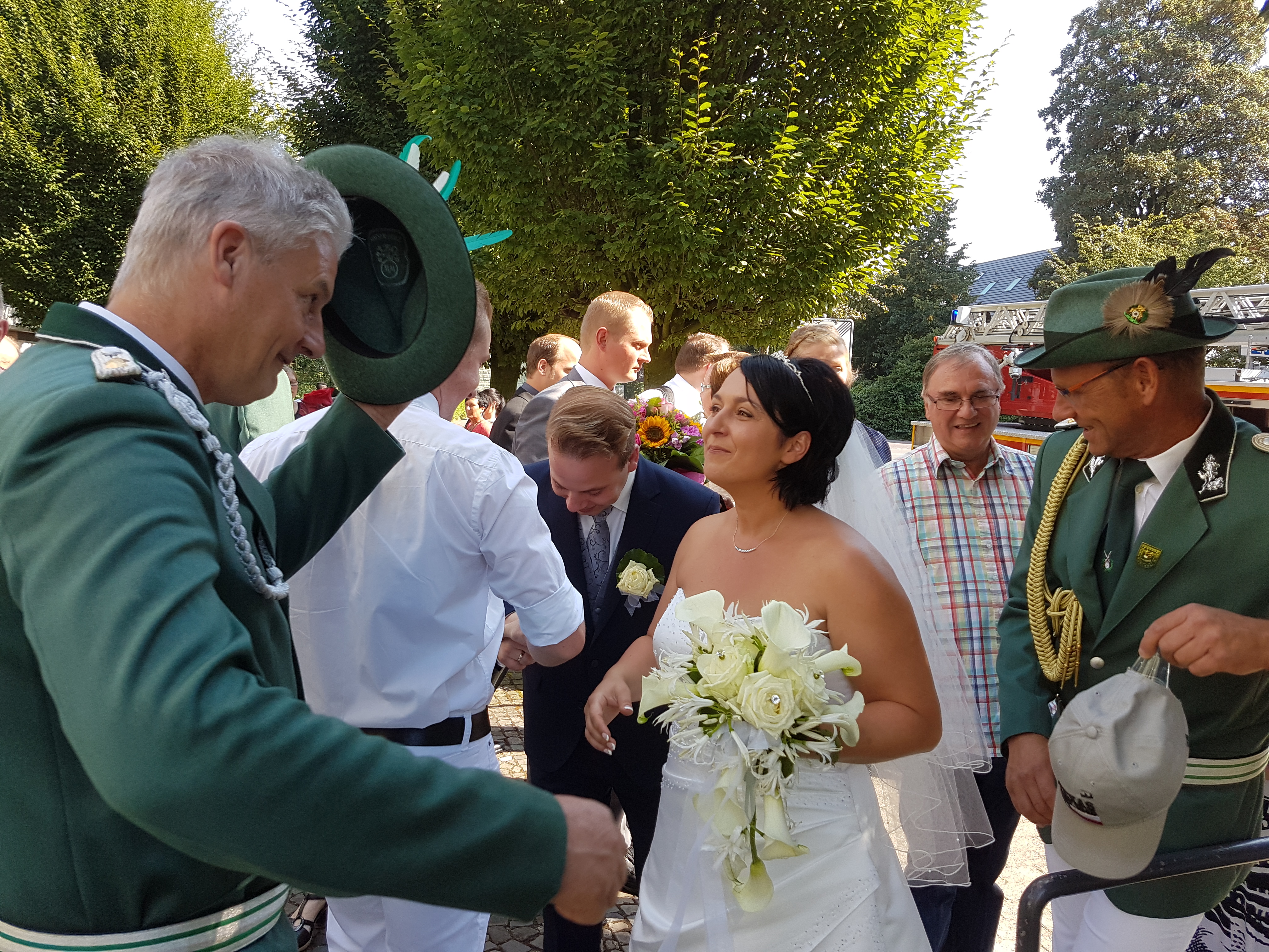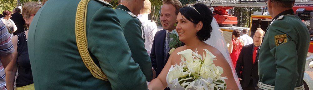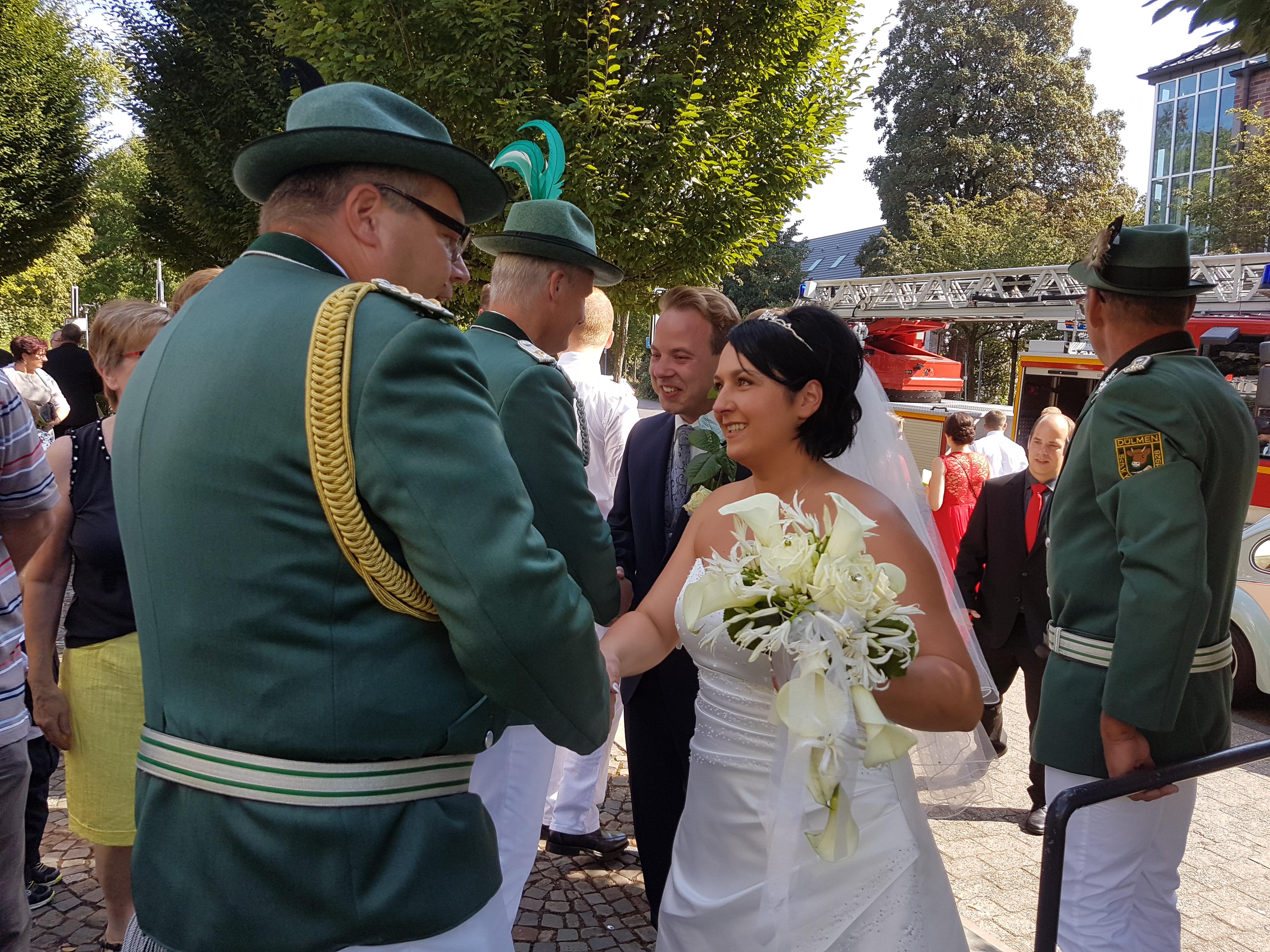 Tina und Dominik Heeringa haben sich am Wochenende in der Christus Kirche ihr Ja-Wort gegeben. Dominik und Tina sind beide aktive Kohvedeler und so war es für eine Selbstverständlichkeit, dass wir dem Paar mit einer Abordnung unsere Aufwartung machten und ihnen für ihre gemeinsame Zukunft „soviel Glück wünschen, wie bei uns heute Schweißtropfen geflossen sind“, so unser Vorsitzender in seiner kurzen Ansprache an die beiden. „Wir wünschen euch, dass eure Ehe immer so ist, wie Tinas früherer Name, dann kann nichts schief gehen“ (Tina trug einmal den Namen „Fröhlich“). Das die Kohvedeler in voller Uniform „allerdings ohne Handschuhe“ aufliefen, hatte Oberst Björn Strietholt so verfügt. „Die Braut ist in weiß, und da sehen die Fotos mit grünen Unifomen einfach besser aus“.