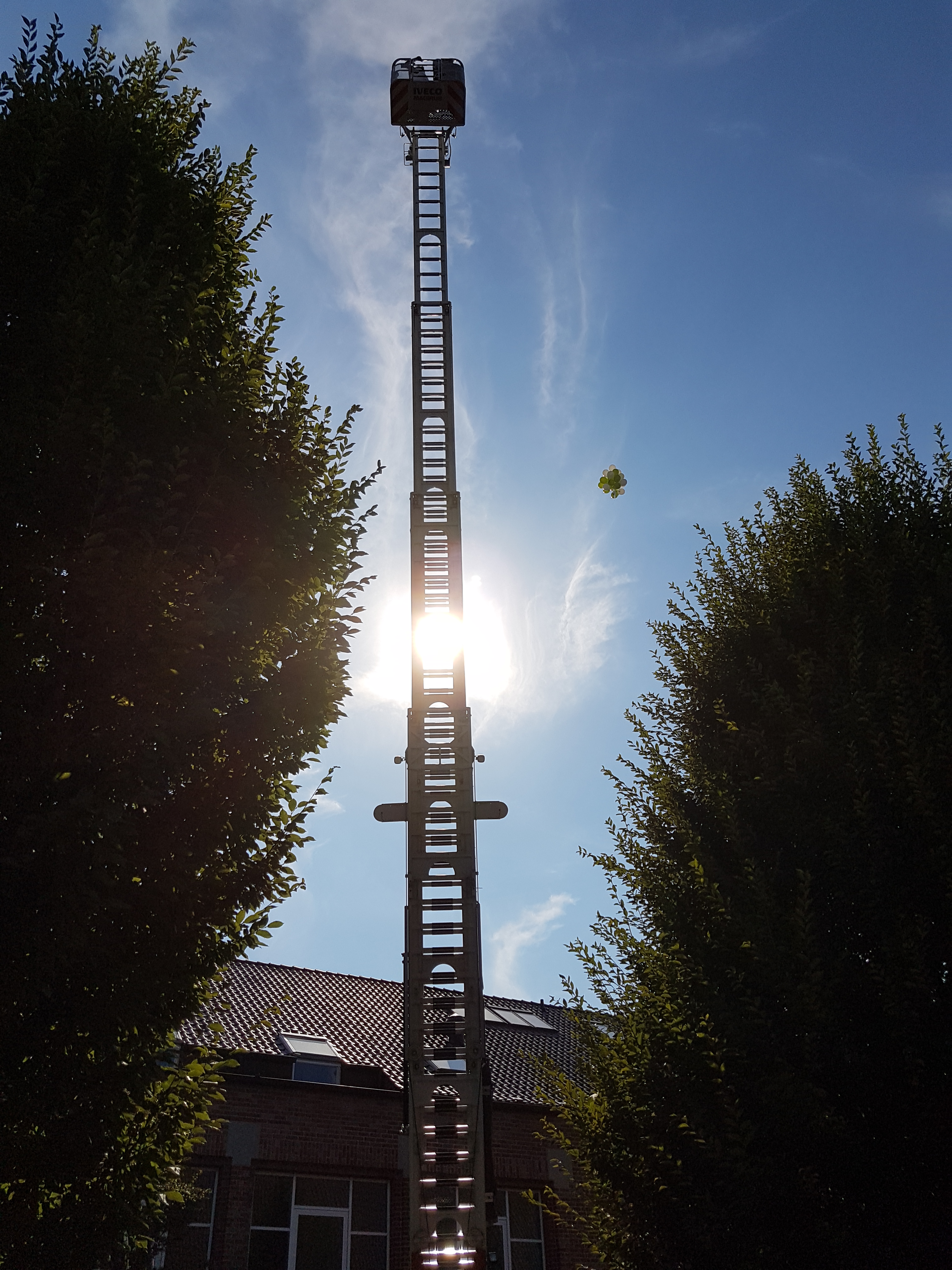 Nach der Messe ging es für die beiden frisch vermählten Kohvedeler hoch hinaus. Da Dominik Mitglied der Feuerwehr Dülmen ist, fuhr er seine Tina mit der Drehleiter in schwindelerregende Höhe über unsere Stadt und präsentierte ihr dort oben einen fantastischen Blick über Dülmen und das Umland. Tina ließ, oben angekommen, zahlreiche „grün-weiße“ Luftballons steigen und machte in dem Korb eine gute Figur. Kein Anzeichen von Höhenangst oder Nervosität.