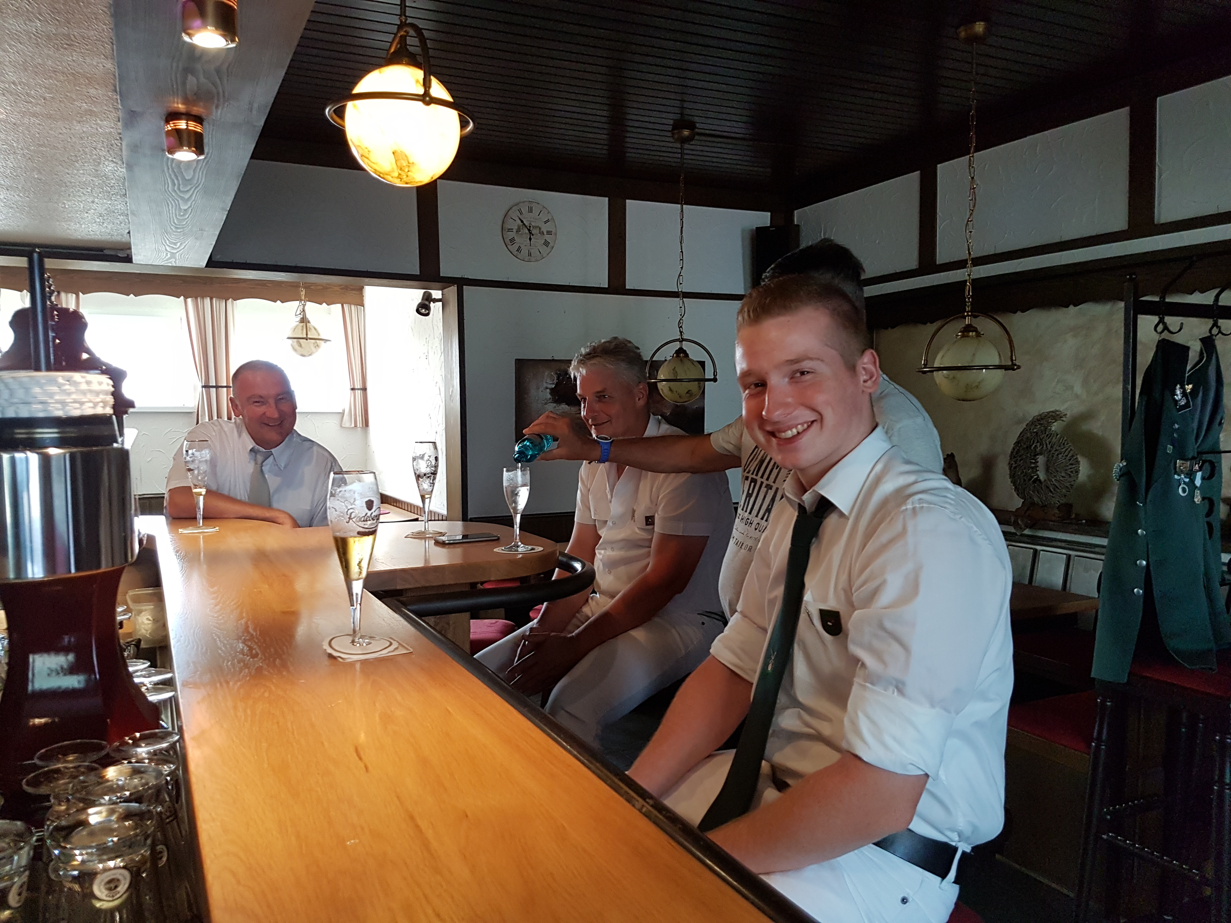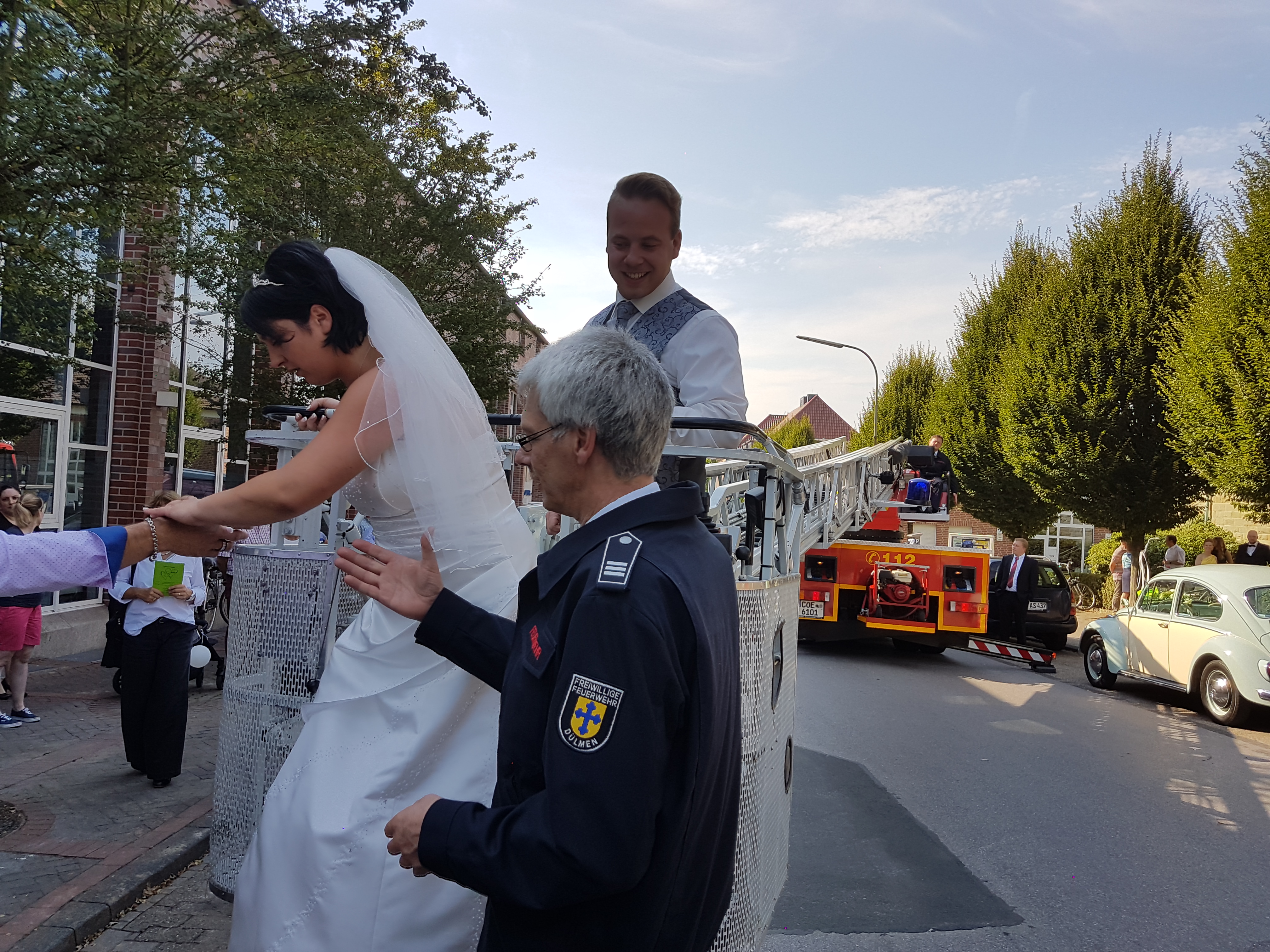 Tropische Temperaturen vor der Kirche, ein Pfarrer, der die Messe knackig kurz hielt und dadurch die Feuerwehr in arge Bedrängnis brachte, ein Spalier der Kohvedeler in voller Uniform, eine Drehleiter und ein Oldtimer, alles Zutaten für eine gnadenlos schöne Hochzeit.