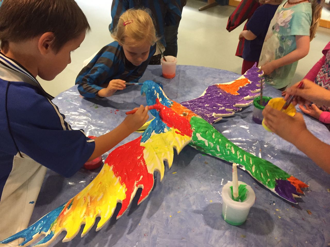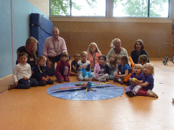 Das Wetter sorgte leider dafür, dass die zahlreichen Attraktionen kurzerhand vom Schulhof in die wetterfeste Schule und angrenzende Turnhalle verlegt wurden. Unser Jungschützenvogel erhielt von den Kindern ein wundervoll buntes Federkleid.