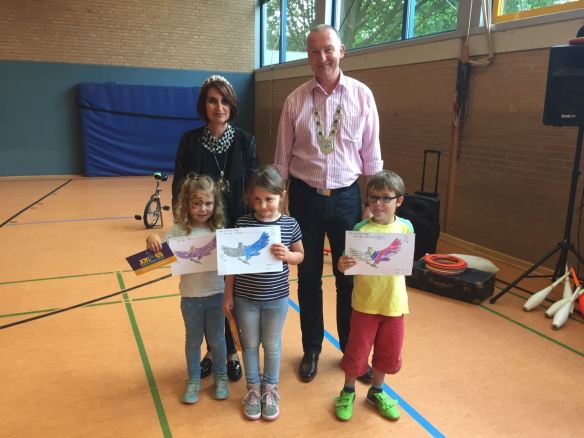 Die Jury um König Thomas Elsbecker und Königin Diana Stein mit Kommandeur Björn Strietholt und Vorsitzendem Volker Dieminger waren sich nach Sichtung der zahlreichen kunstvollen Gemälde sehr schnell einig, dass eine gerechte Entscheidung über das schönste Bild und den besten Namen nicht möglich ist; zu sehr hätten sich die Kinder ins Zeug gelegt und tolle Ergebnisse geliefert. Also entschieden sich die Mitglieder der Jury spontan um und überließen der Glücksfee die Entscheidung der erstplatzierten Kunstwerke. Für die Plätze drei bis eins gab es Gutscheine des Joy´n Us im Wert von 10,–, 20,– und 30,– Euro. Alle übrigen Kinder erhielten einen Lolly mit einem Gutschein für eine Kindertüte, die sich die Kinder am Schützenfestsonntag im Zelt abholen können.