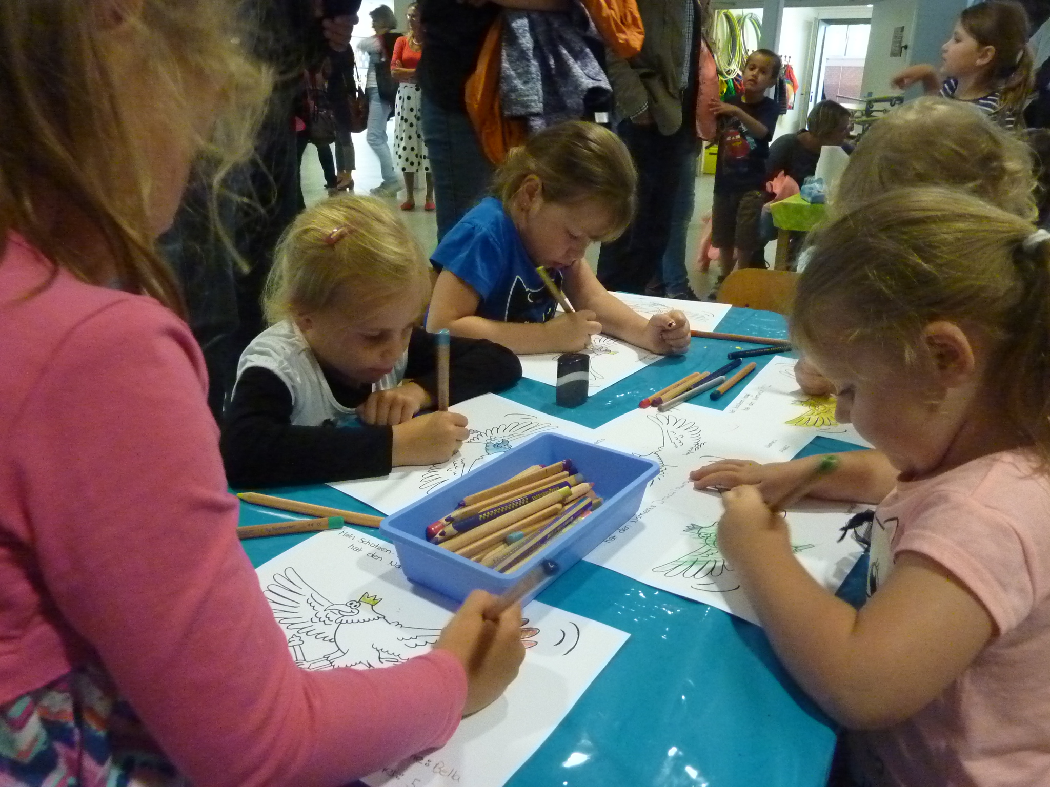 Gleichzeitig beteiligten sich zahlreiche Kinder an der Malaktion. Aufgabe war es hier, einen Schützenvogel auf einem DIN A 4 Bogen auszumalen und ihm einen Namen zu geben, ihn also für die Taufe vorzubereiten.