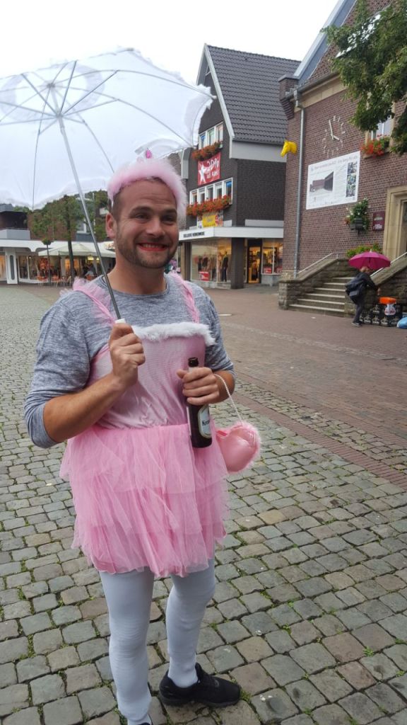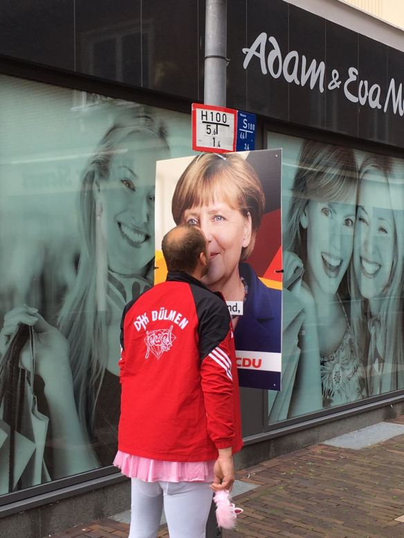 Bei dem nun nicht so optimalen Wetter war es außerordentlich schwierig, eine Jungfrau auf dem Marktplatz dazu zu bewegen, unseren Junggesellen frei zu küssen. Somit wurde ihm erlaubt, sich bei unserer Kanzlerin frei zu küssen. Davon hat er dann auch langanhaltend und ausgiebig Gebrauch gemacht. Ob es Angela auch gefallen hat, konnten wir trotz intensiver Recherche nicht in Erfahrung bringen. Die anschließende Feier, so hören wir aus bestens unterrichteten Quellen, ging bis in die frühen Morgenstunden des Sonntags.