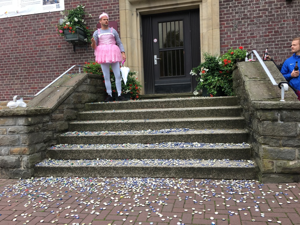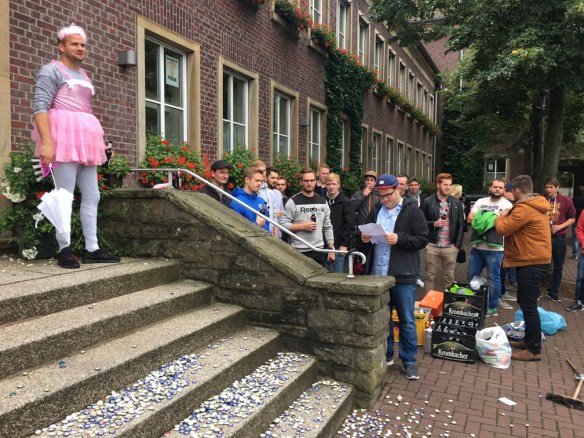 Maurice Gröger feierte am Wochenende seinen 30. Geburtstag nach. Als kleine Auftaktveranstaltung hatte Schützenbruder Dennis Niewerth ein Treppefegen für „Mo“ organisiert. Neben einigen Kohvedlern war auch die Familie und die TSG Fußballmannschaft anwesend. Alle hatten in der Vergangenheit reichlich Kronkorken gesammelt und so konnte Mo rund 2 Eimer Korken aufsammeln.