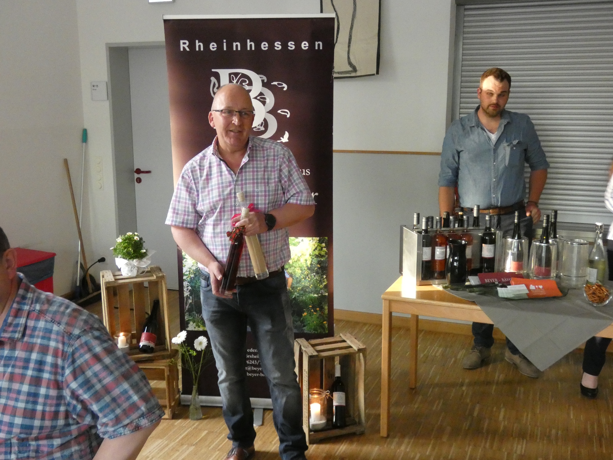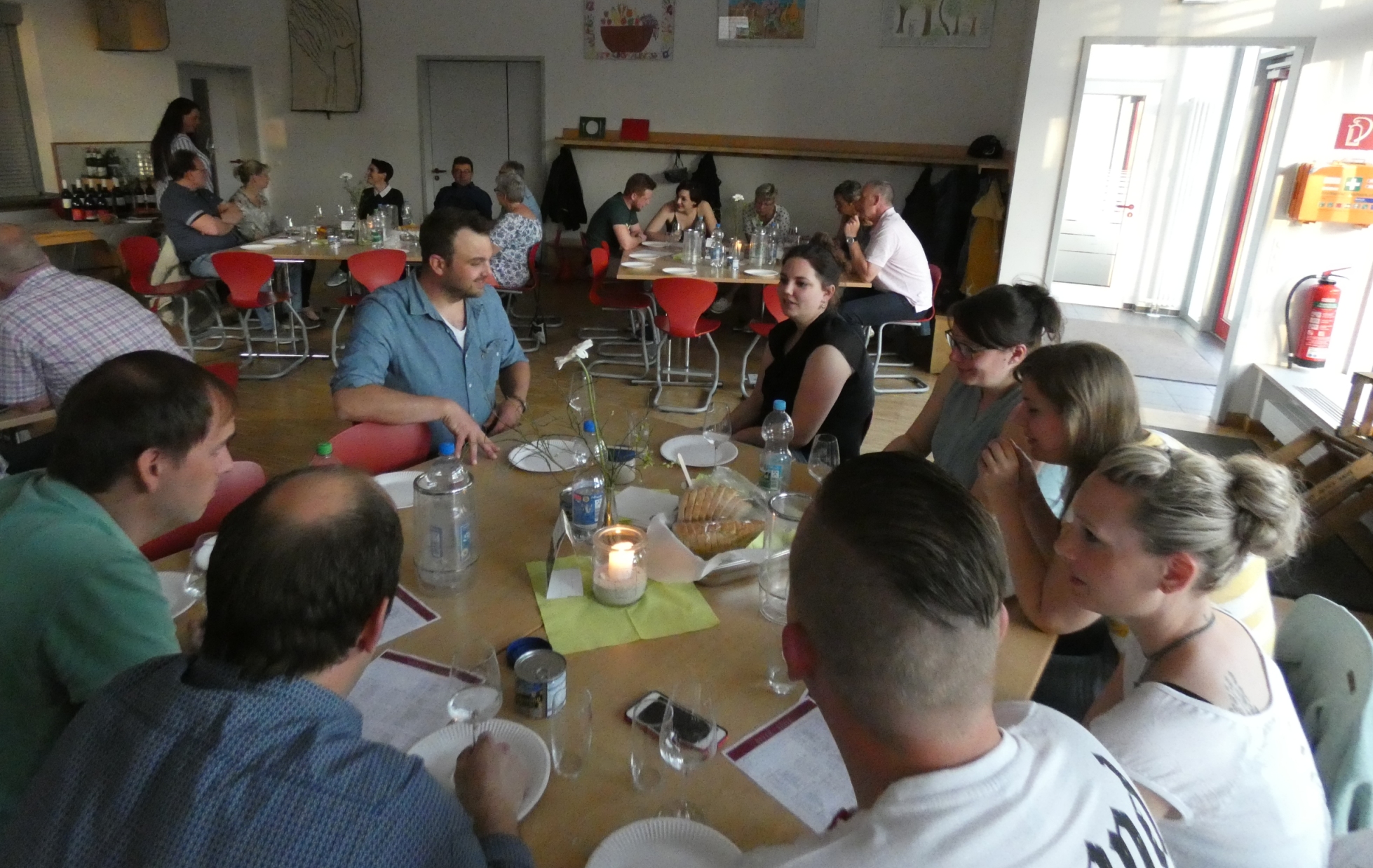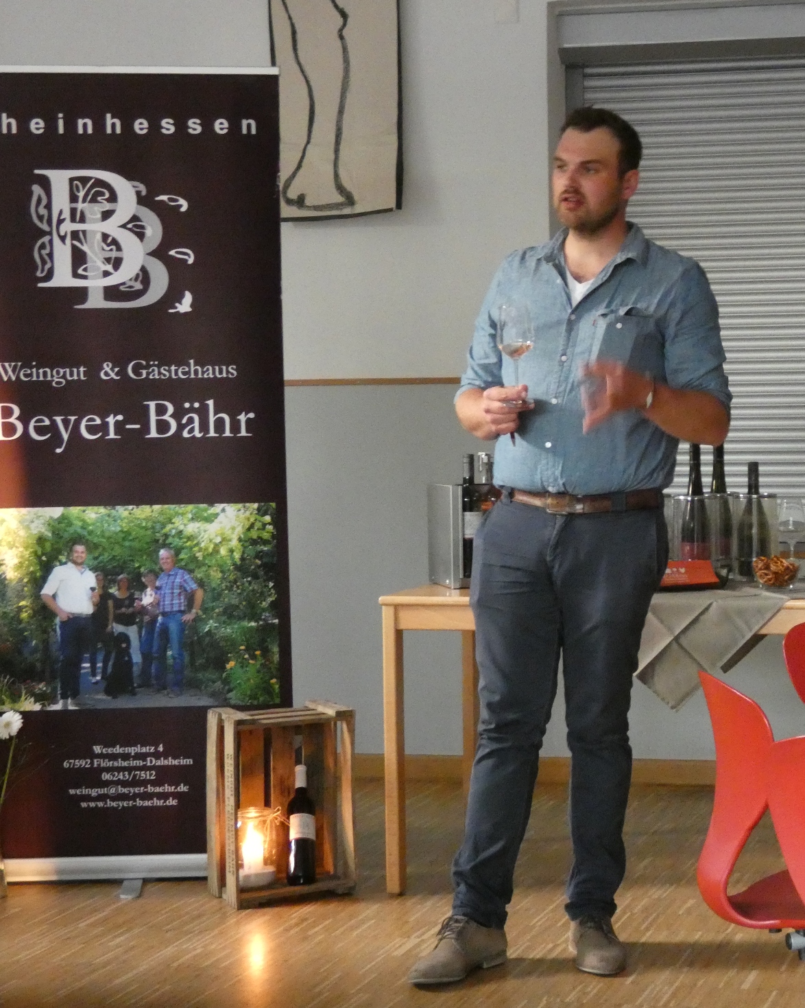 Das sympathische Winzerpaar Lucien und Sebastian vom Weingut Beyer-Bähr hatten zahlreiche ihrer Weine, Sekt- und Prosecco-Sorten mitgebracht und begrüßten die Gäste zunächst mit einem alkoholfreien Prosecco, der bei vielen Teilnehmerinnen und Teilnehmern für Erstaunen sorgte; ist es doch ein seltener Tropfen.