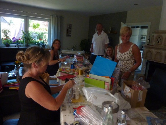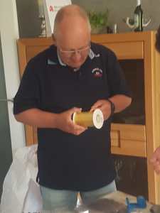 Das Verlosungsteam hat sich heute bei strahlendem Sonnenschein im Garten von Annegret und Heinz Pankock getroffen und die Preise für die Sonntags-Verlosung vorbereitet und verpackt.