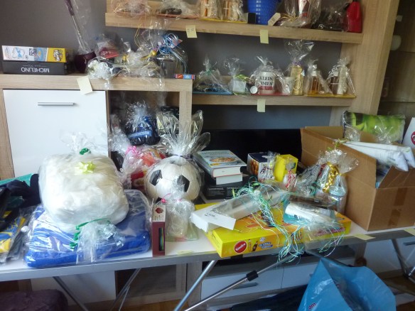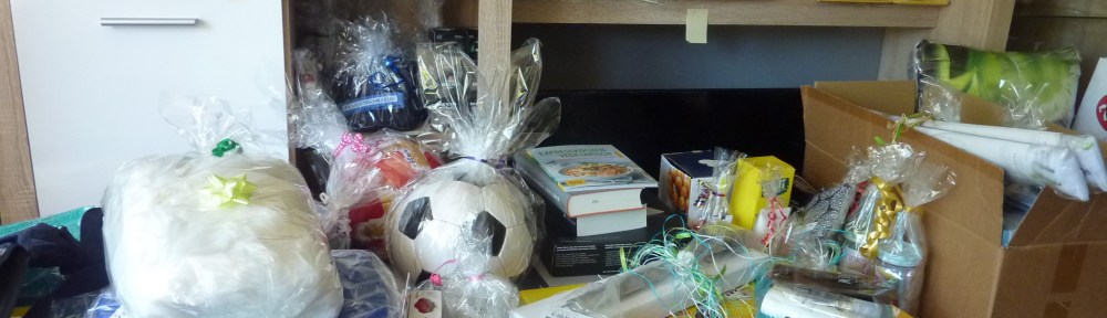Die Männer unter den Teammitgliedern gaben sich alle Mühe, die Preise annähernd so attraktiv zu verpacken, wie es die Damen vormachten. Dabei hatten manche bereits mit dem Geschenkband zu kämpfen.