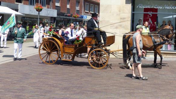 Perfekter hätte der Tag nicht sein können. Sonne, ein leichter Wind, angenehme Temperaturen, ein Bilderbuchschützenfestsonntag. Die gute Stimmung war greifbar, als am Sonntagmittag die beiden Königinnenkutschen mit Königin Michaela Lücke, Prinz Niels Winkler und ihrem Gefolge auf dem Marktplatz einmarschierten,