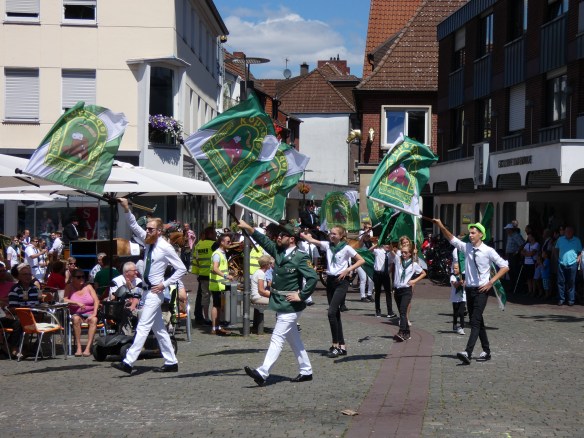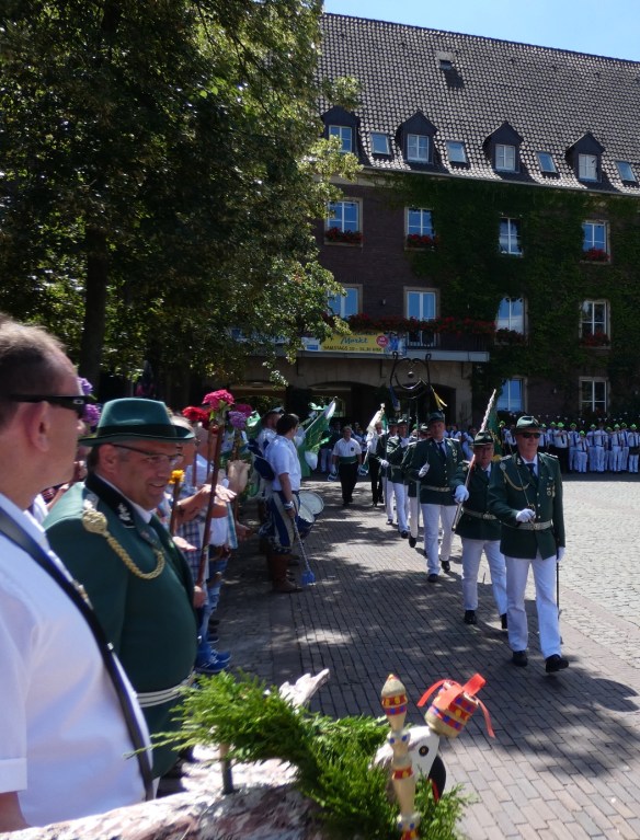 Mit Begleitung des 1. Landsknecht Fanfarenkorps Haltern am See, des Spielmannszuges Wulfen 1927 e.V. und der Stadtkapelle Dülmen setzte sich der Zug dann in Marsch zum Festplatz am düb, wo bereits der Altschützenvogel darauf wartete, traktiert zu werden.