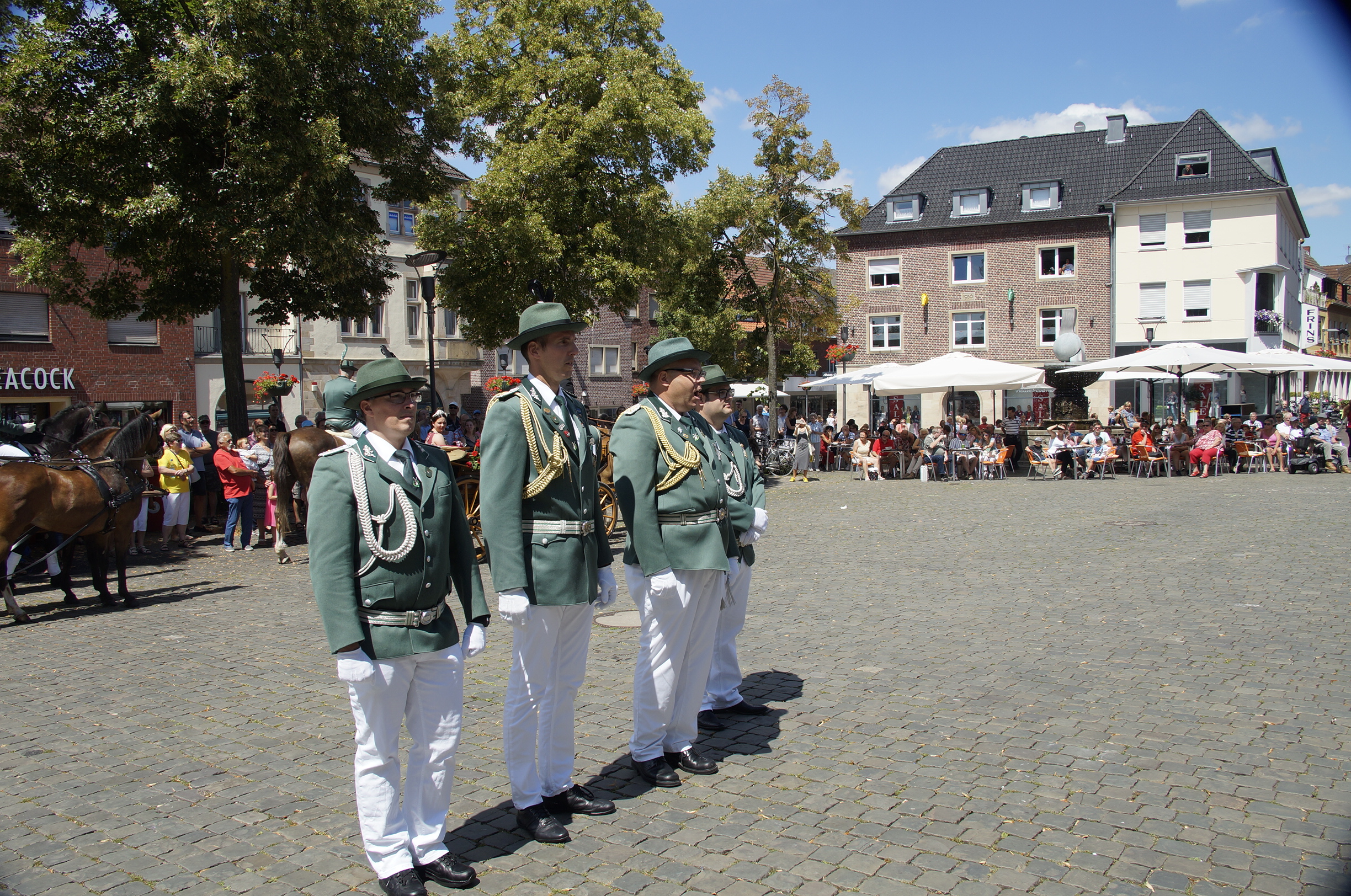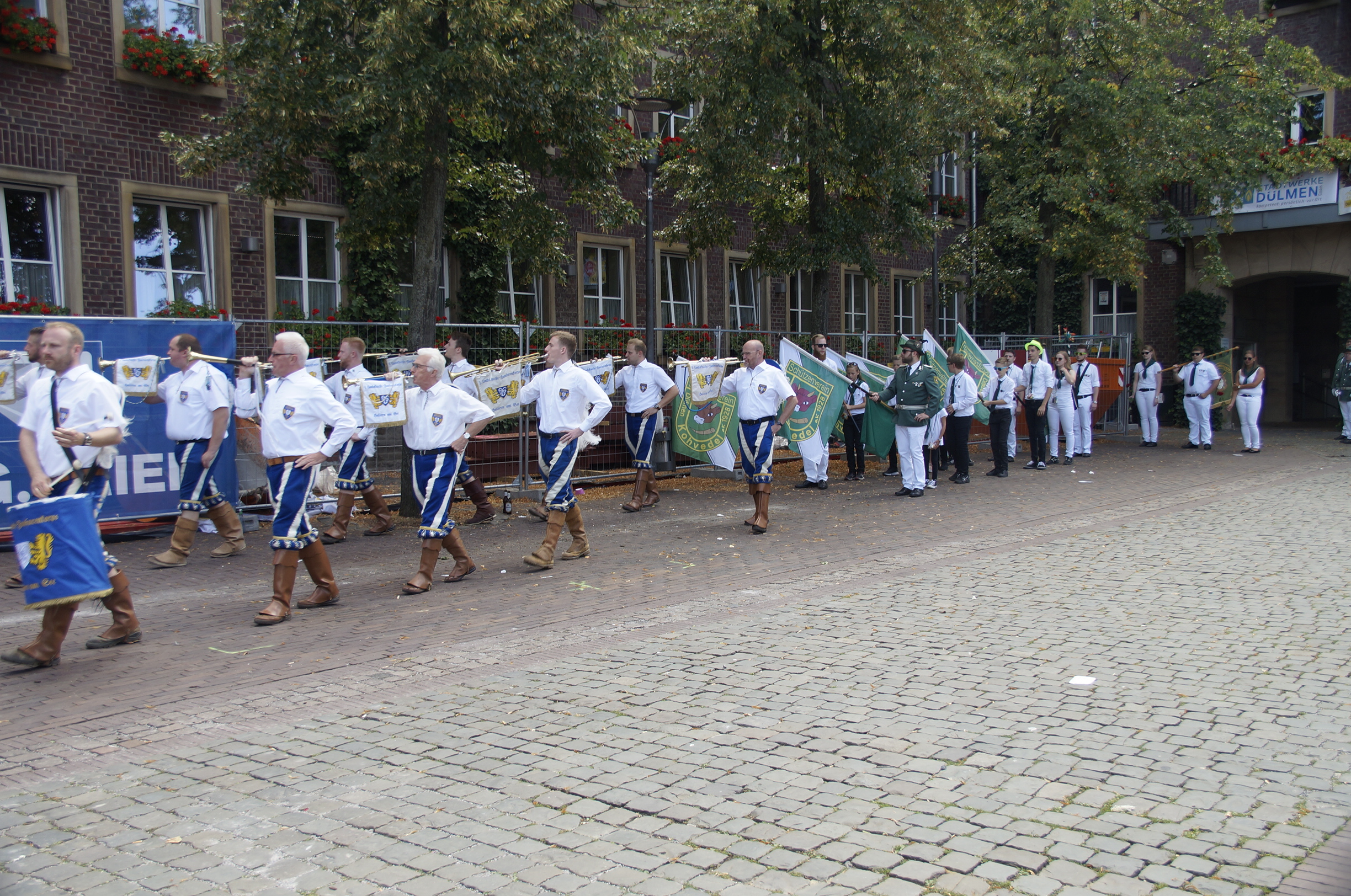 Mit Begleitung des 1. Landsknecht Fanfarenkorps Haltern am See, des Spielmannszuges Wulfen 1927 e.V. und der Stadtkapelle Dülmen setzte sich der Zug dann in Marsch zum Festplatz am düb, wo bereits der Altschützenvogel darauf wartete, traktiert zu werden.