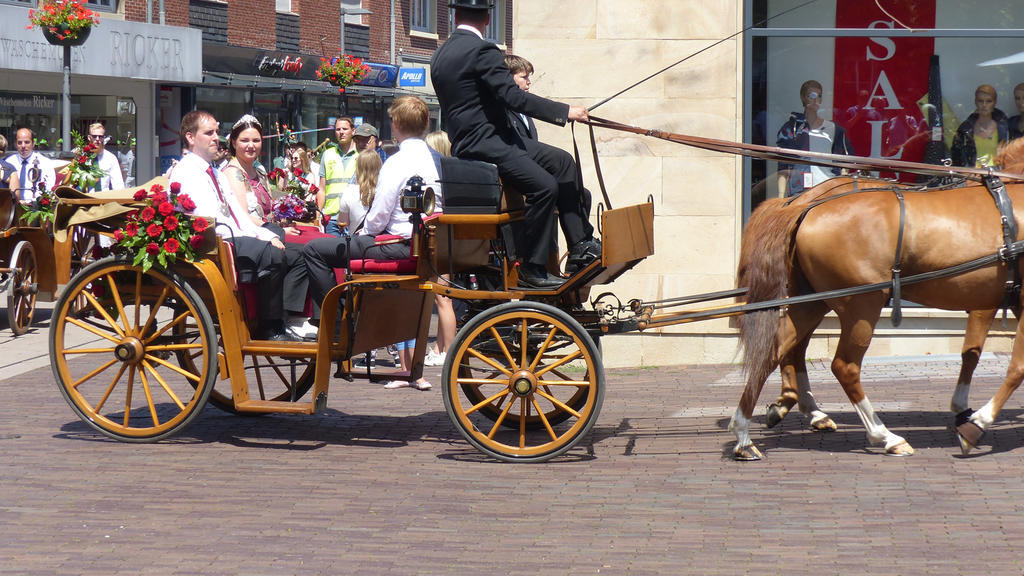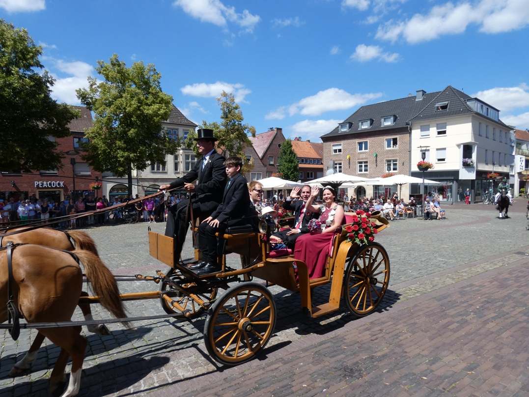 Perfekter hätte der Tag nicht sein können. Sonne, ein leichter Wind, angenehme Temperaturen, ein Bilderbuchschützenfestsonntag. Die gute Stimmung war greifbar, als am Sonntagmittag die beiden Königinnenkutschen mit Königin Michaela Lücke, Prinz Niels Winkler und ihrem Gefolge auf dem Marktplatz einmarschierten,