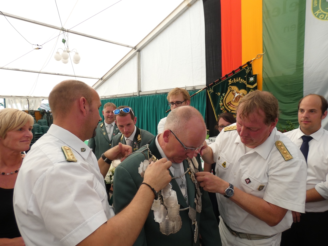 Anfänglich tummelten sich noch zahlreiche Schützen unter dem Stand und nahmen das Federvieh ins Visier. So auch unser Vorsitzender Volker Dieminger, der einmal sagte, er würde nur dann zur Vogelstange gehen, wenn er auch König werden will. Für einige aktive Kohvedeler zeigte sich von daher bereits frühzeitig, was sich später bestätigen sollte.