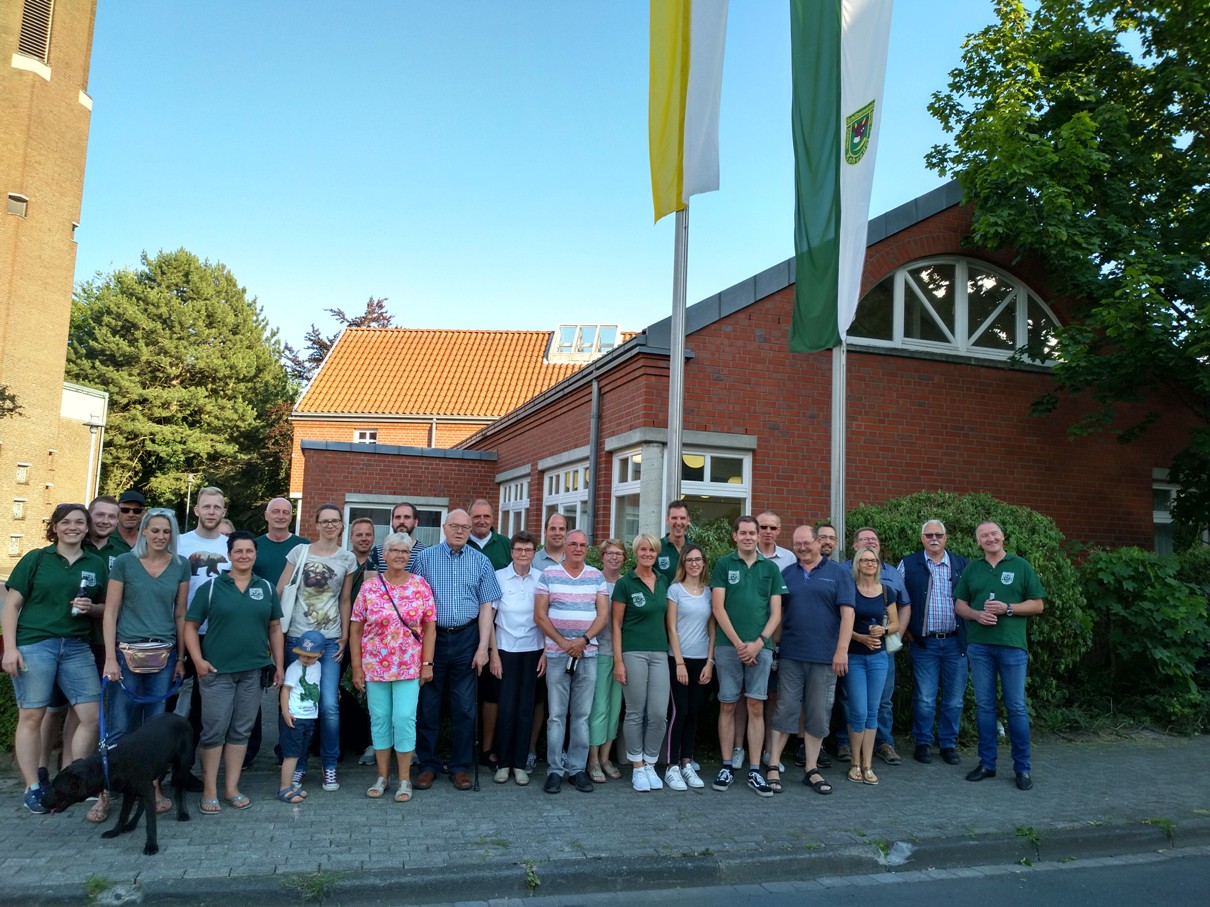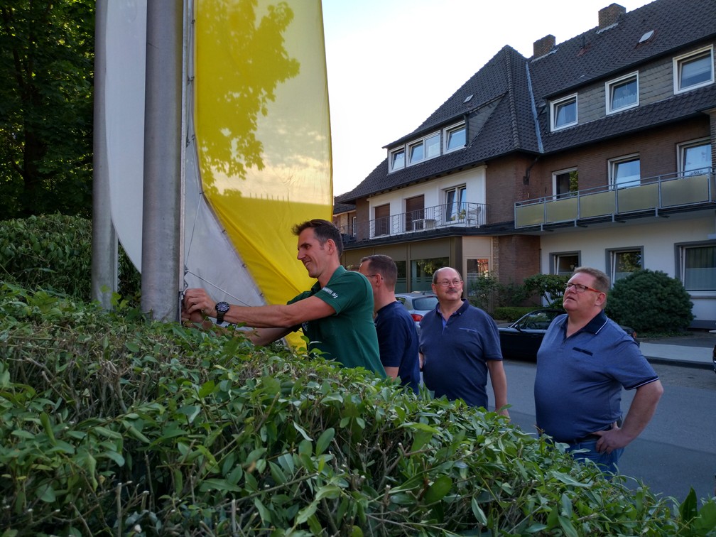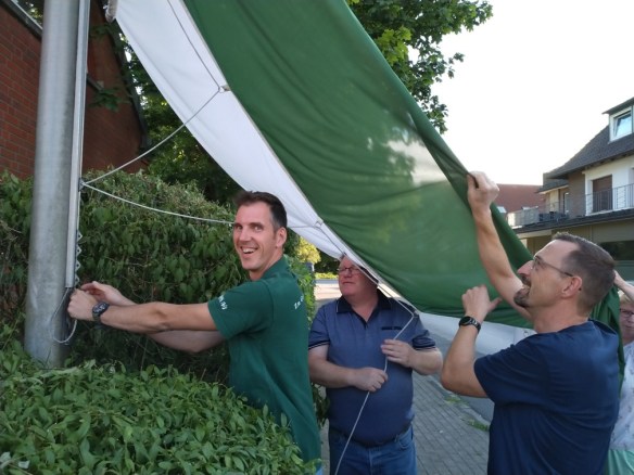 Das Hissen der Fahne vor der Kirche geht auf eine Initiative unseres Offiziers Martin Wewerink zurück, der vor Jahren diese Aktion mit der Kirche abgesprochen und ins Leben gerufen hat. „Anfangs wurde der Termin genutzt, um auch eine Kontrolle der Schützenuniformen und Ausrüstungsgegenstände vorzunehmen“, erinnert sich Vorsitzender Christian Jasper, „doch scheinbar gab es eine Woche vor dem Fest noch zahlreiche ungeklärte Kleidungsfragen, so dass die Kandidaten aus den daraufhin angeordneten „Strafliegestützt“ gar nicht mehr herauskamen. Von daher haben wir die Kontrolle auf das Festwochenende verlegt“ schmunzelt er mit einem Augenzwinkern.