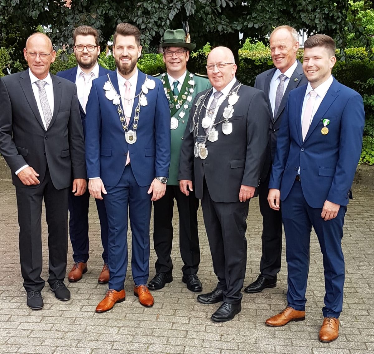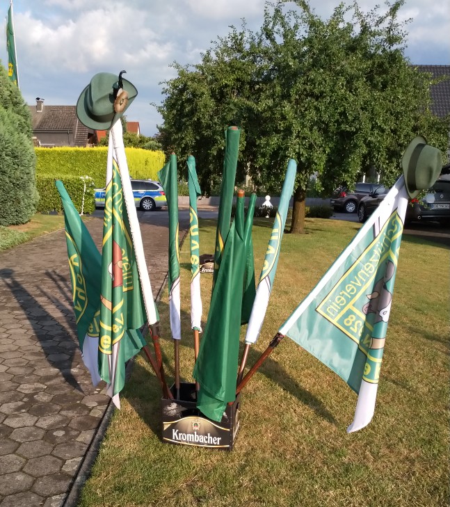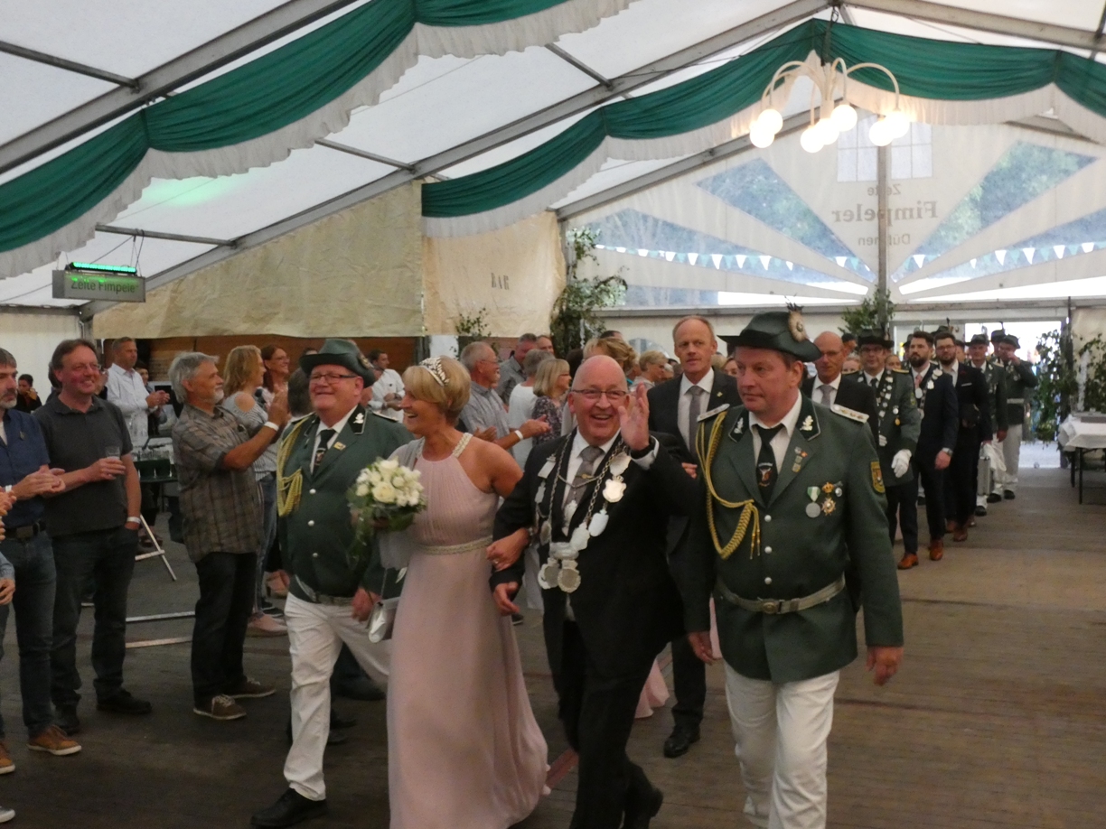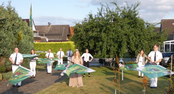 Nach dem gemeinsamen Gottesdienst wurden die beiden Königshäuser um Jungschützenkönig Philipp Schieve und Jungschützenkönigin Lea Dieminger, sowie das Seniorenkönigspaar Marlies und Volker Dieminger mit ihren Ehrenpaaren von zahlreichen Schützinnen und Schützen zum gemeinsamen Marsch zum Festzelt am düb abgeholt. Jungschützenkönigin Lea Dieminger hatte sich dabei für ihren Vater etwas besonderes ausgedacht und organisiert: „Es war immer Vaters Wunsch, dass die Fahnenschläger, die damals als Vater in den Verein eingetreten ist geschlagen haben, noch einmal die Fahne für ihn schlagen. Ich freue mich, dass es mir gelungen ist, doch noch den ein oder anderen dafür reaktivieren zu können.“ Volker genoss die Darbietung sichtlich gerührt und dankte vor allem den ehemaligen Fahnenschlägern und seiner Tochter für diese tolle Überraschung.