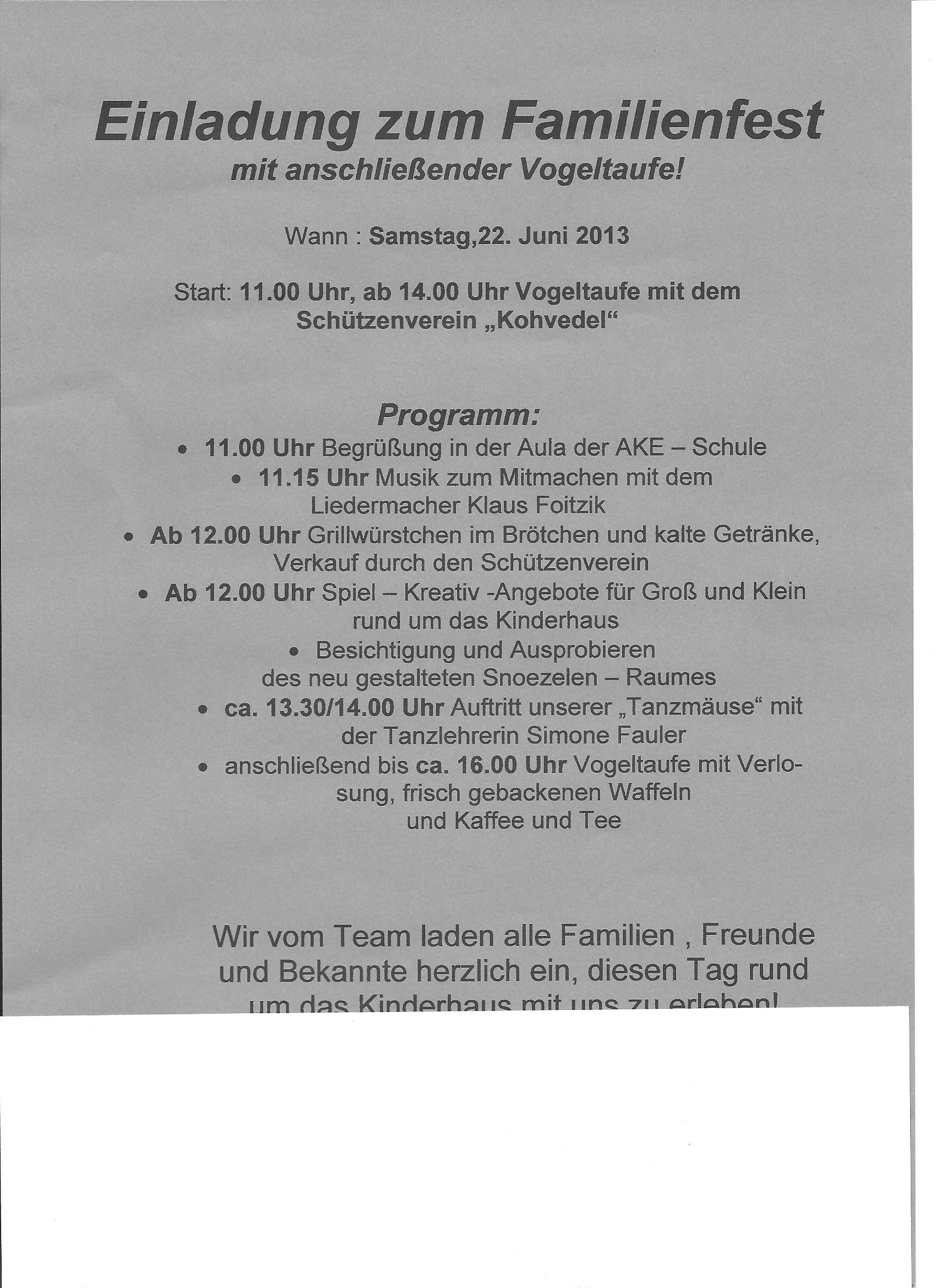 Die Vorbereitungen laufen auf Hochtouren und unser 2. Vorsitzender Andre Fauler hat alles sicher im Griff. Nachdem wir hunderte Flyer und Einladungen zum Familienfest und zur Vogeltaufe verteilt haben, geht nun auch das Familienzentrum Kinderhaus Am Luchtbach in die Werbeoffensive. Der unten abgebildete Infobrief wurde gezielt an fast 100 Kinder verteilt, aber auch für uns enthält er einige interessante Termine und Hinweise. Also Jungs und Mädels, Mütter und Väter, Omas und Opas….das ist euer Tag. Seid dabei wenn wir einen wunderschönen Tag gemeinsam mit unserem Kooperationspartner Kinderhaus Am Luchtbach verleben werden. Seid zu Gast bei guten Freunden und gebt unserem Vogel einen neuen Namen und ein schönes Kleid. Wir freuen uns auf euch.
