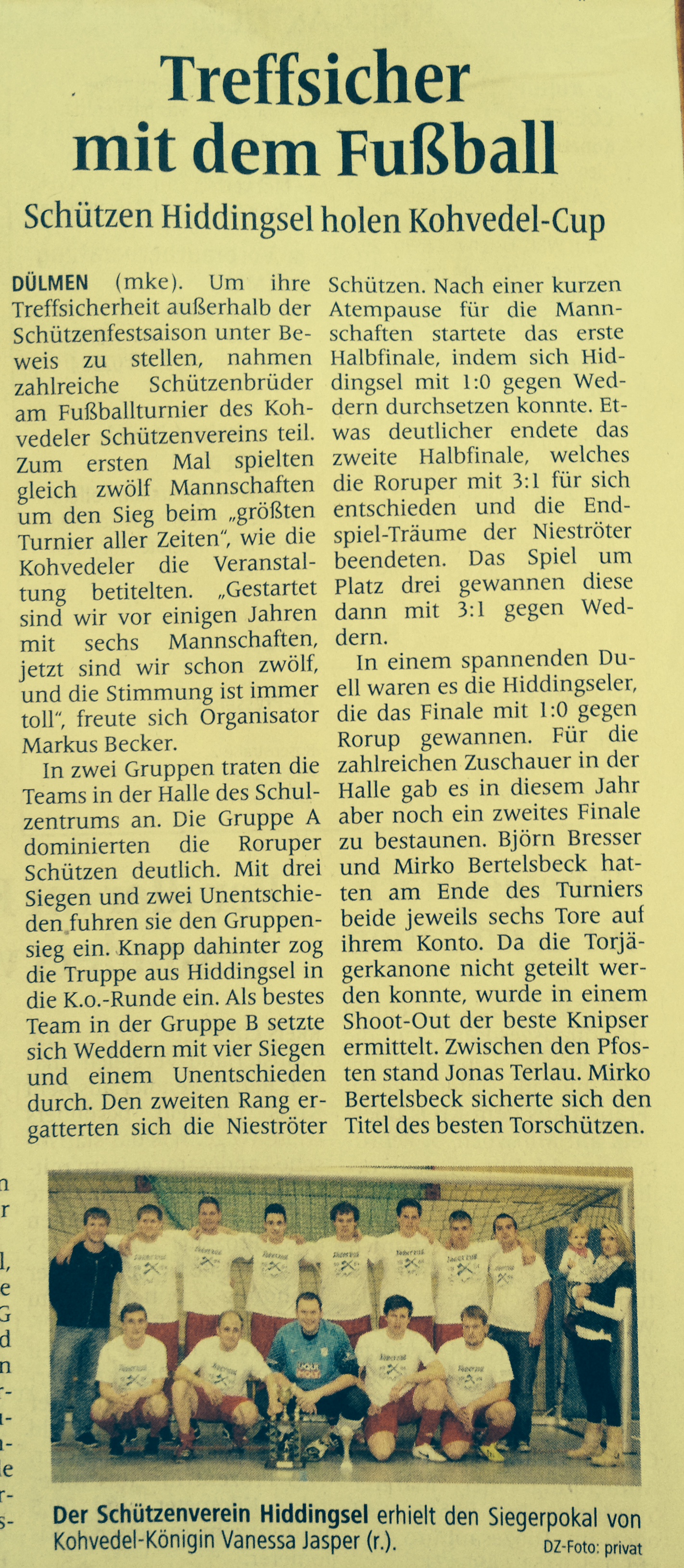 Gewonnen haben in diesem Jahr die Schützenbrüder aus Hiddingsel, die damit den Börnster Schützen als Gewinner der Turniere 2012 und 2013, einen angestrebten Hattrick vermiesten. In einem packenden Finale setzten sich die Hiddingseler mit einem knappen 1:0 gegen Rorup durch.
